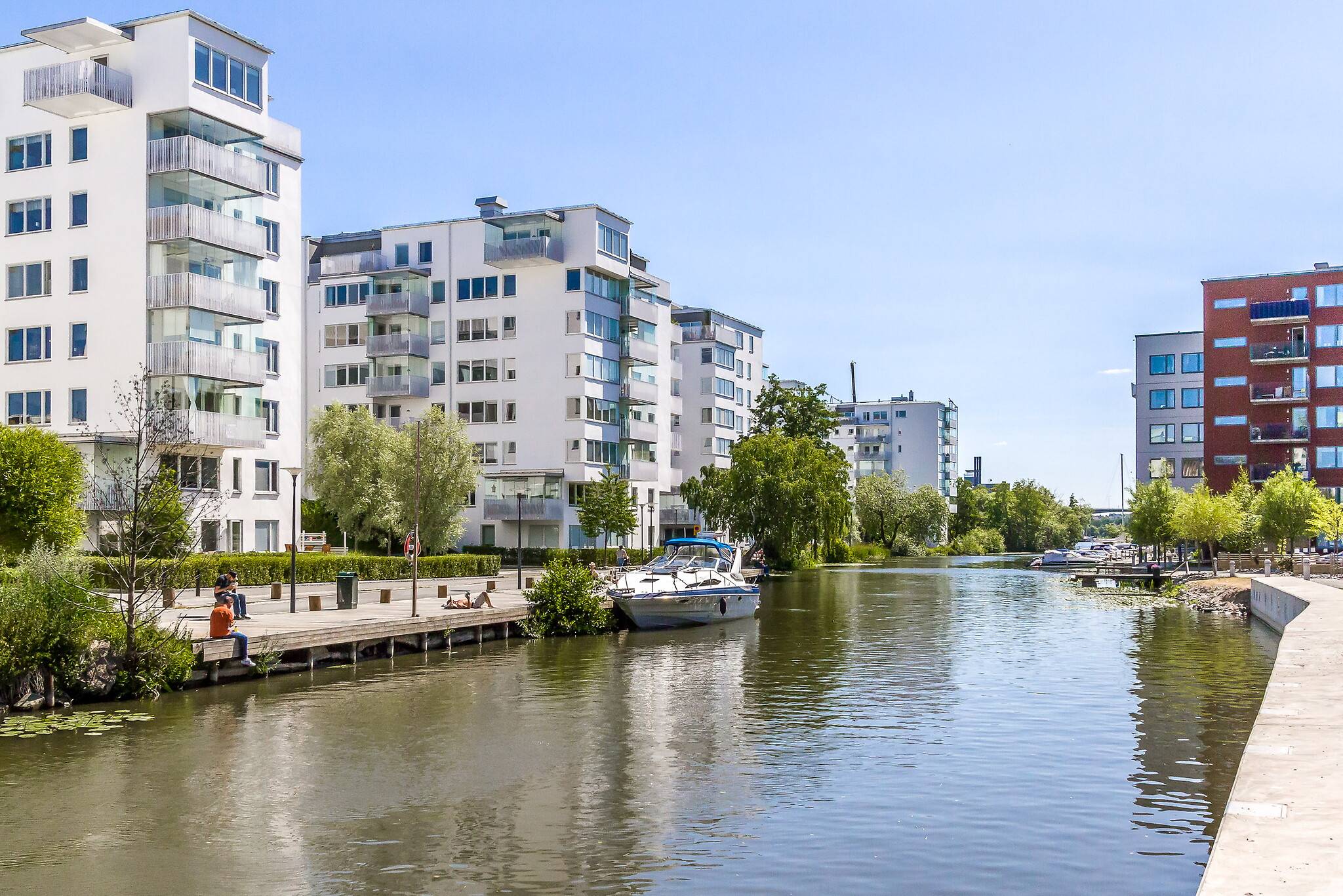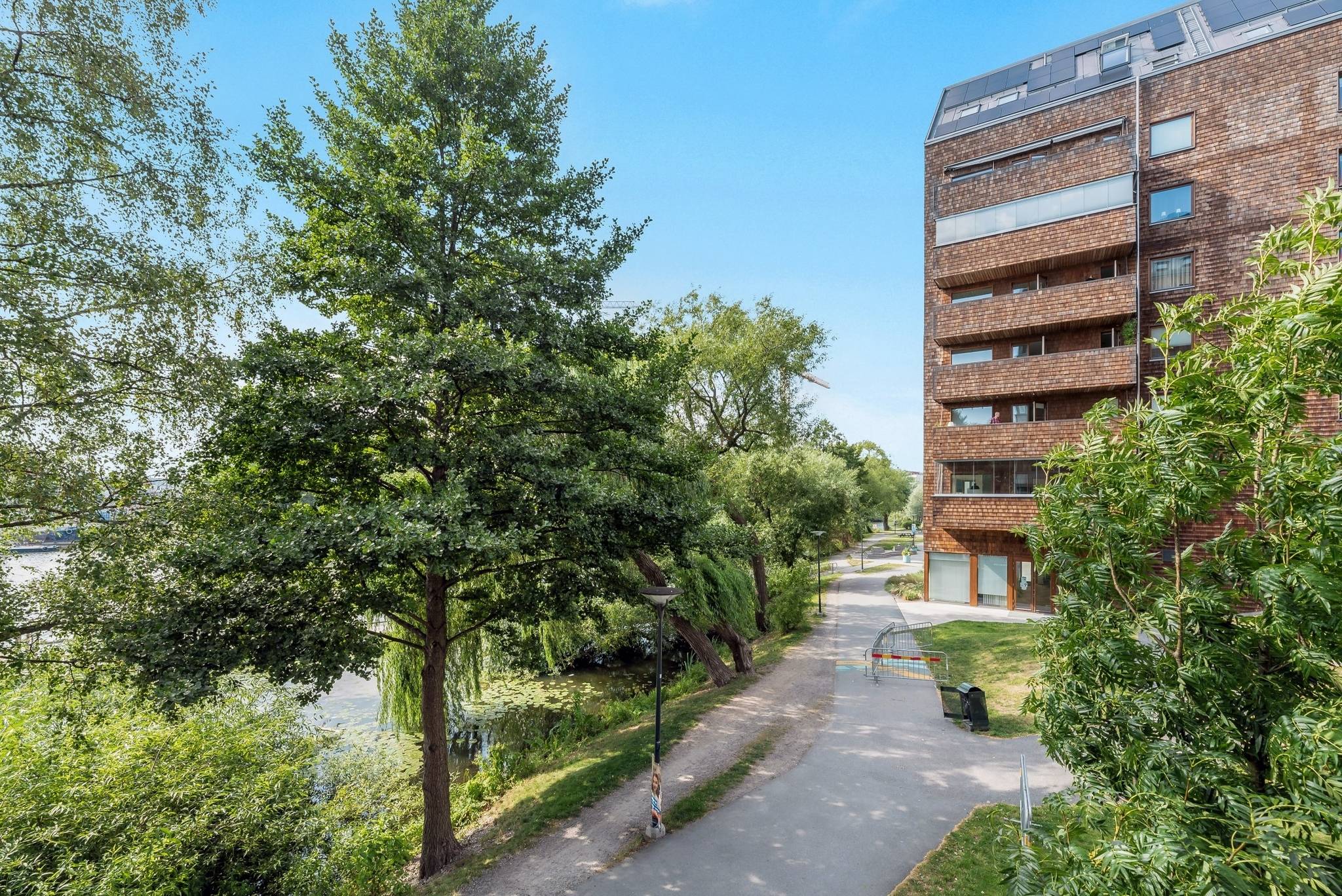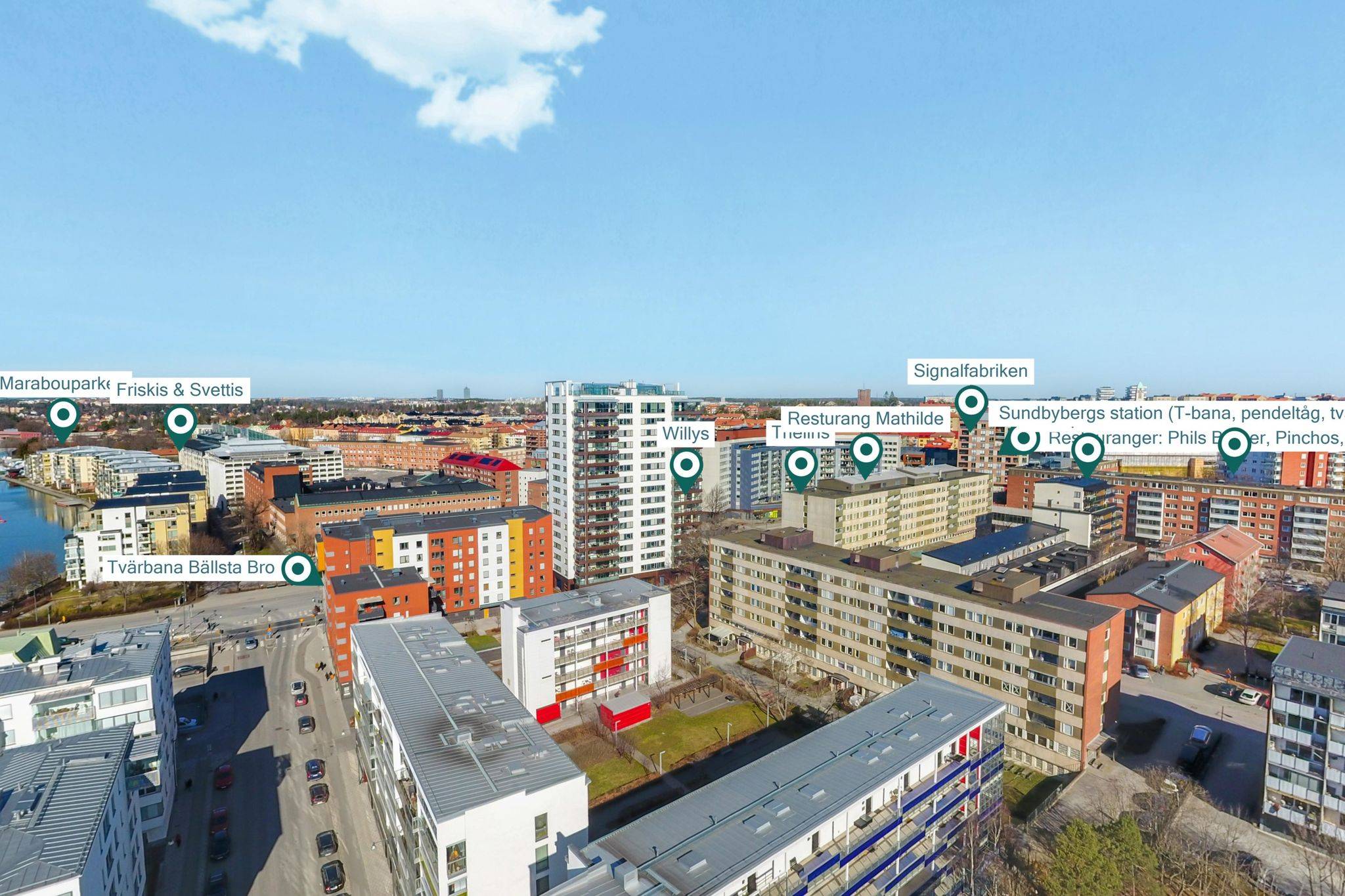 Med ett av Sundbybergs absoluta topplägen, vid Bällstaåns glimrande vatten och trivsamma båtliv, erbjuds nu denna unika trea (registrerad 4:a) utöver det vanliga! Bostaden ligger högt upp i huset på femte våningen med genomgående hög standard i både kök och badrum. Lägenheten nås enkelt med hiss från såväl garage som entrévåning. De sociala ytorna med vardagsrum, kök och balkong ligger i anslutning till varandra och från samtliga fönster i bostadens sociala delar bjuds det på en fin utsikt över vattnet. Fina solnedgångar kan ni blicka ut över från soffgruppen med fri himmelsvid sikt Från vardagsrummet nås också den inglasade balkongen i sydostläge har ni sol från tidig förmiddag till ca 17 tiden. Lyxigt badrum nås från hallen med dusch, städskåp, förvaringsskåp, samt tvättmaskin/torktumlare, under praktisk avlastningsbänk. Ytterligare ett badrum med dusch nås från hallen. Master bedroom är stort med plats för bred säng och diverse sovrumsinredning. Stora garderober med skjutdörrar optimerar klädförvaring. Det andra sovrummet är trivsamt med stort fönster som släpper in gott om ljus. Golvet i hela våningen pryds av ett snyggt ljuspigmenterat plankgolv. Goda förvaringsutrymmen finns i klädkammare, garderober och separat stort källarförråd som praktiskt ligger på entrévåningen bredvid hissen! Lägenheten är från början registrerad som en 4 rok vilket gör att de som önskar med enkla medel kan omdisponera lägenheten till en fyra. Se alternativ planlösning. Här bor du i en stabil HSB förening med bekvämligheter som hiss hela vägen ner till garaget och förråd. Föreningen har också en gemensamhetslokal med övernattningsmöjligheter samt kök och badrum/toalett. Sist men inte minst erbjuds en bastu som kan utnyttjas av medlemmarna. Båtbryggorna och den vackra stilrena fasaden i cederträ inger en idyllisk och inbjudande känsla. Kombinationen av city (med endast 8 minuters pendelavstånd till Stockholms innerstad) och närheten till vattnet ger ett optimalt boende att trivas i. Förutom pendeltåg erbjuder Sundbyberg dessutom tunnelbana, tvärbana och bussar. Härifrån kan man t.o.m. gå till Bromma flygplats. För den som vill ta pendelbåten in till stan finns en hållplats vid Solna strand. Gångavstånd har man även till Bromma Blocks ett av Sveriges modernaste köpcentrum eller varför inte ta en promenad längs vattnet förbi Pampas Marina i Solna och vidare till Vasastan eller Kungsholmen. Bara någon minut bort har man nya Signalfabriken med butiker och restauranger. Sundbyberg är en stad i staden med allt inom räckhåll! Välkommen!46 images