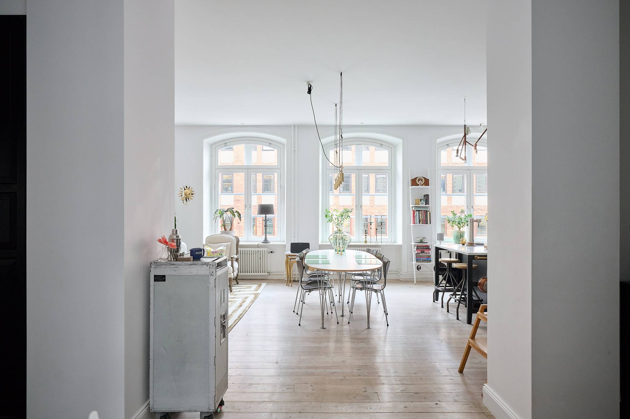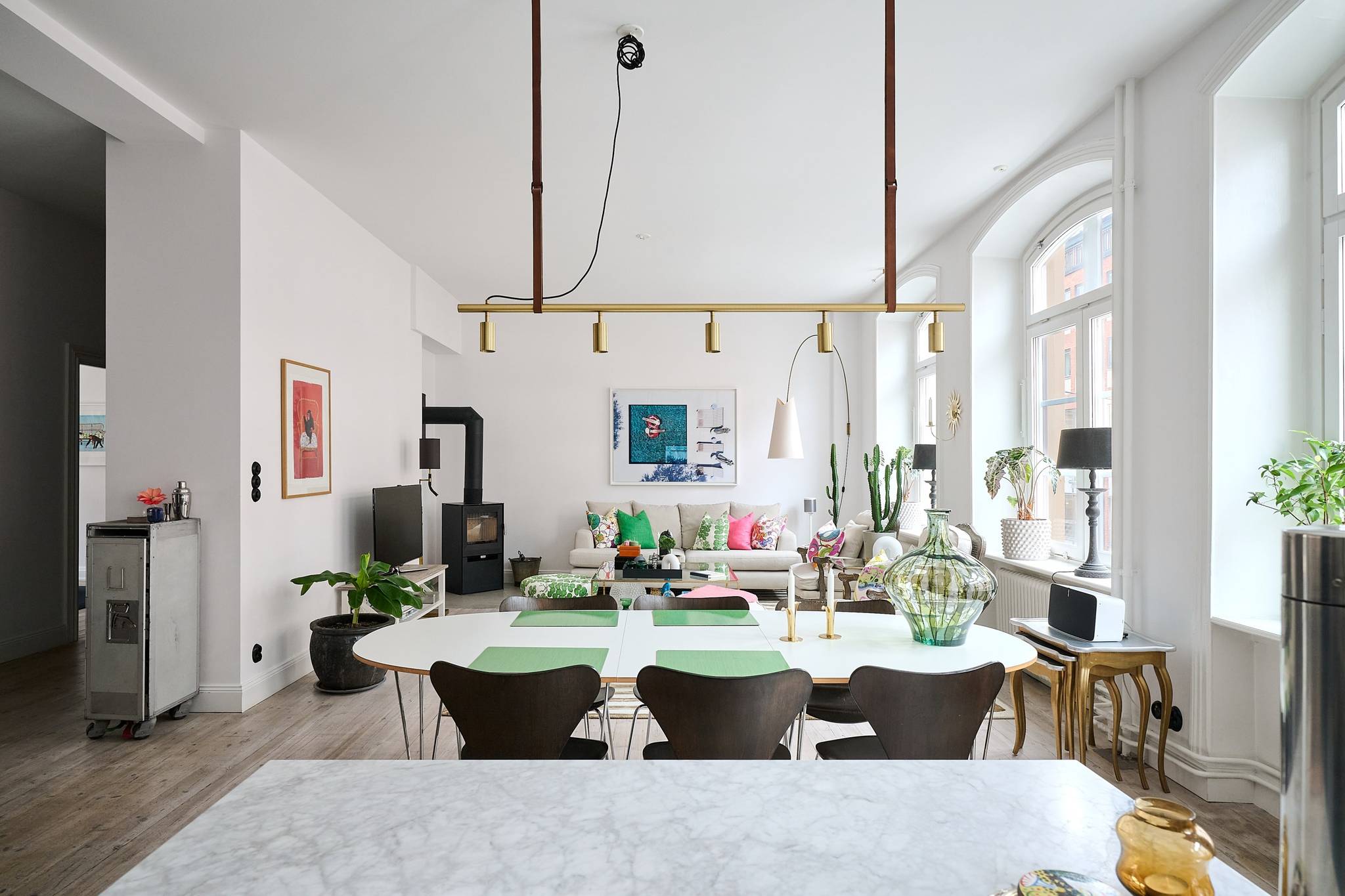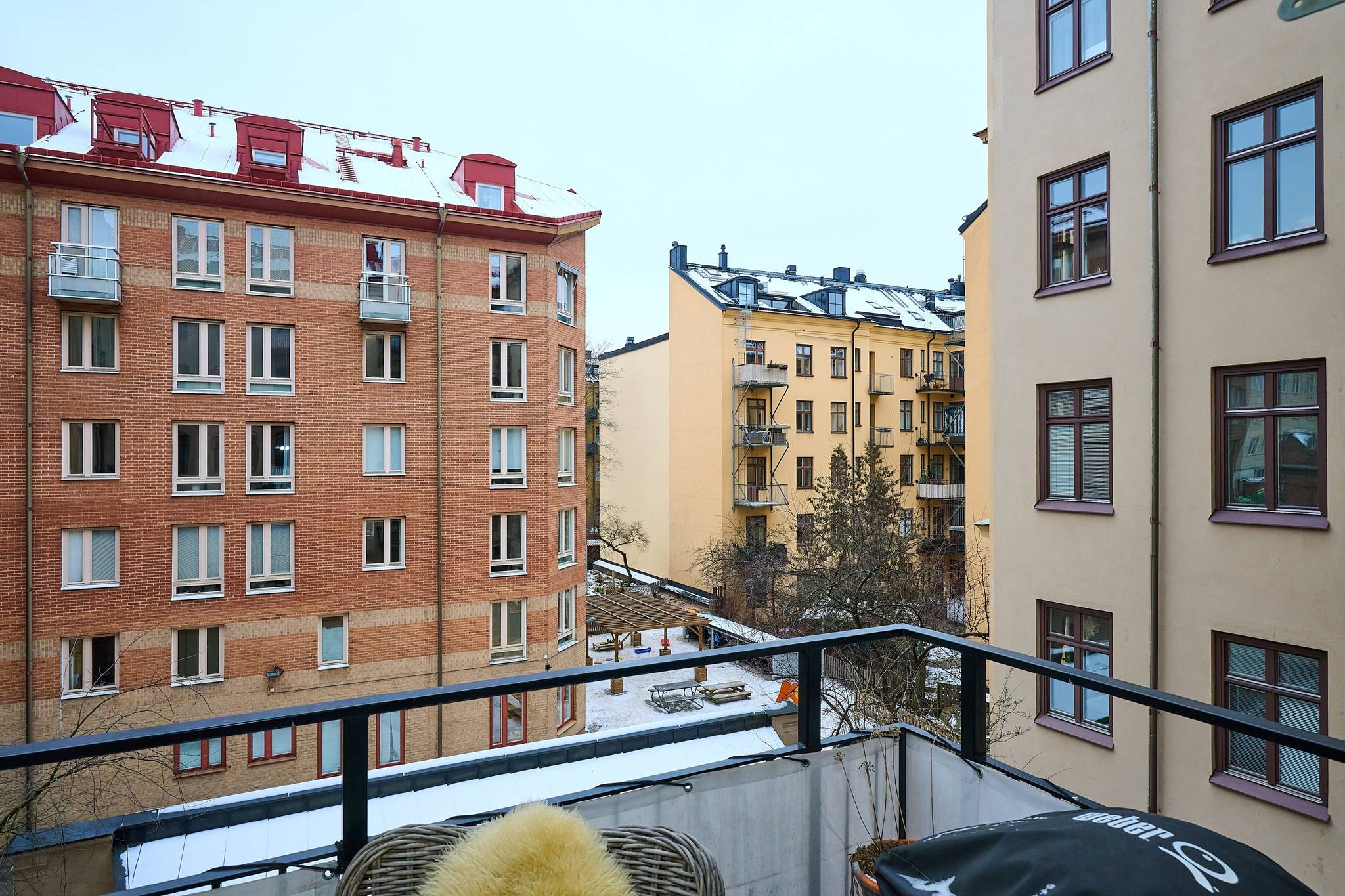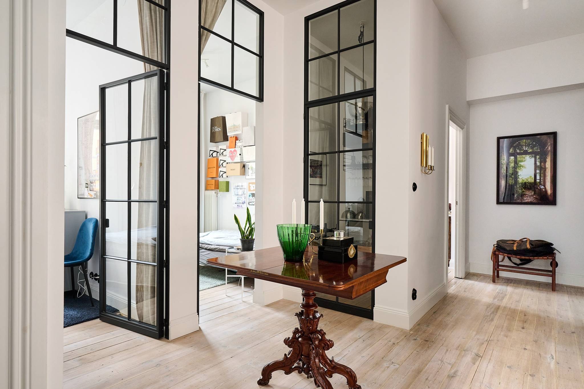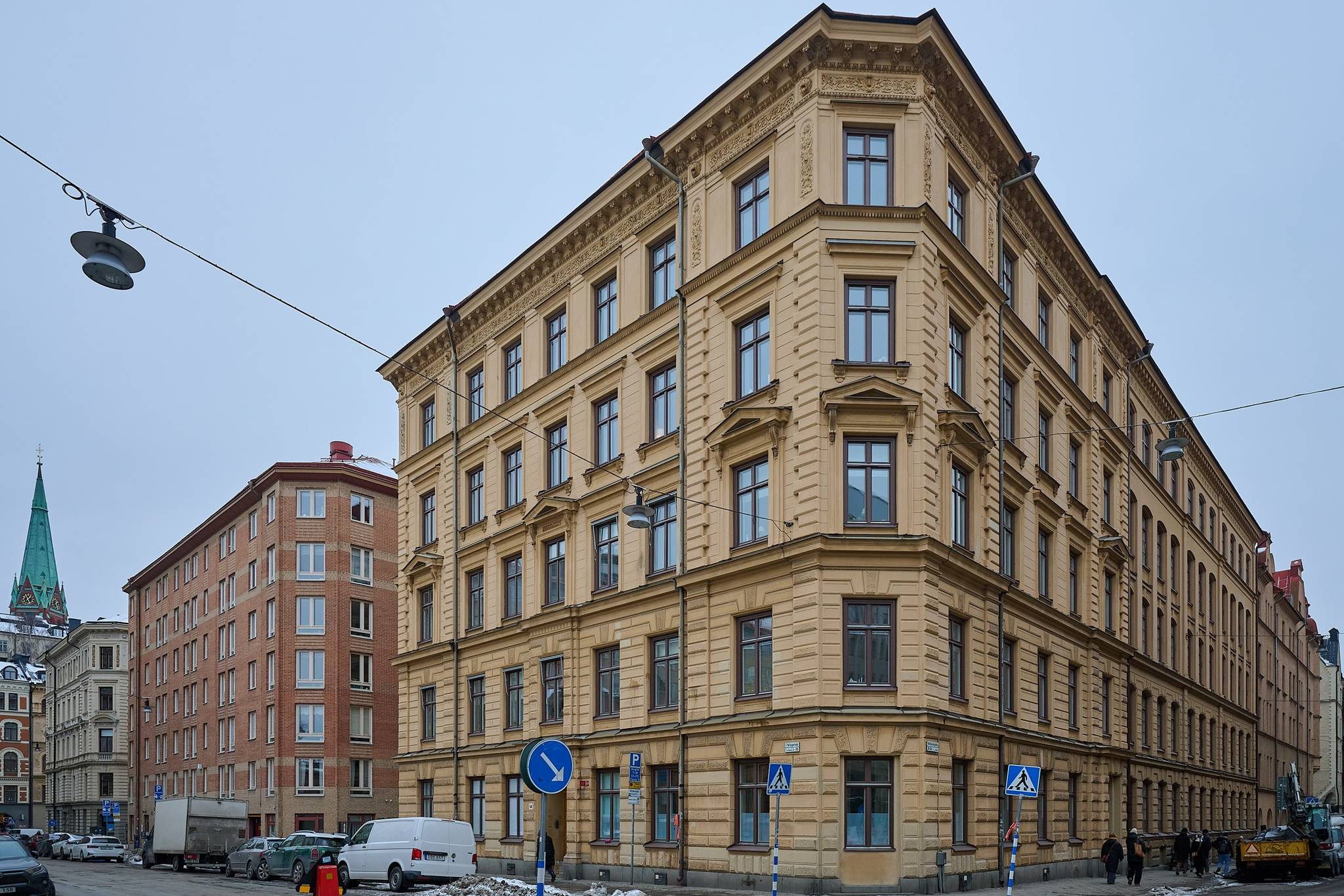 I hörnet av Rådmansgatan och Tulegatan tronar det pampiga sekelskiftespalatset från 1891. Byggnaden spelar en viktig roll för den svenska industrihistorien då den från börja rymde en av LM Ericssons första produktionsanläggningar. Det lika lugna som centrala läget inser du snabbt om du lutar dig ut från ett av sällskapsytornas fyra, takhöga fönsterpartier. Cirka 200 meter till vänster skymtar grönskan borta vid Sveavägen, och knappt 80 meter ner till höger reser sig en kastanj på Birger Jarlsgatan. Den ljusa våningen är smakfullt detaljrenoverad med fokus på tidsperiodens tidlösa formideal och detaljer. Kvar finns rader av nästan takhöga, spröjsade fönsterpartier med rundade överfönster. De grafitsvarta spegeldörrarna har stiltrogna beslag i gulmetall, listverken är detaljskurna och den till stor del öppna planlösningen släpper iväg patinerade furugolv över fria ytor under en ansenlig takhöjd. Byggnadens industrihistoria följs stilsäkert upp av samtida design som flera inslag av takhöga glaspartier i svart industriglas samt entréhallens oljade betonggolv. Våningens huvudnummer är de mycket stora sällskapsytorna i öppen planlösning med kök. Raden av takhöga fönsterpartier med överfönster och djupa nischer skapar en mycket speciell atmosfär. Härinne finns plats för både sällskapsdel framför den mysiga kaminen och ett stort matsalsbord. Köket delas av med en fristående köksö med barhäng i ljus Carraramarmor som även återfinns på de långa arbetsytorna. Designlinjens grafitsvarta fronter med speglar och beslag i mässing kommer igen i kökets inredning. På samma sätt återkommer den ljusa marmorn på golv och väggar i våningens gäst-WC och sobra badrum i sekelskiftesstil. Våningen har även tre sovrum mot innergården, balkong, glasat vinrum, tvättavdelning, walk-in-closet, rymlig garderobsvägg mm. Det lika lugna som centrala läget behöver troligen ingen djupare förklaring, med bara ett några minuters promenad till citykärnan eller områdets många parker.26 images