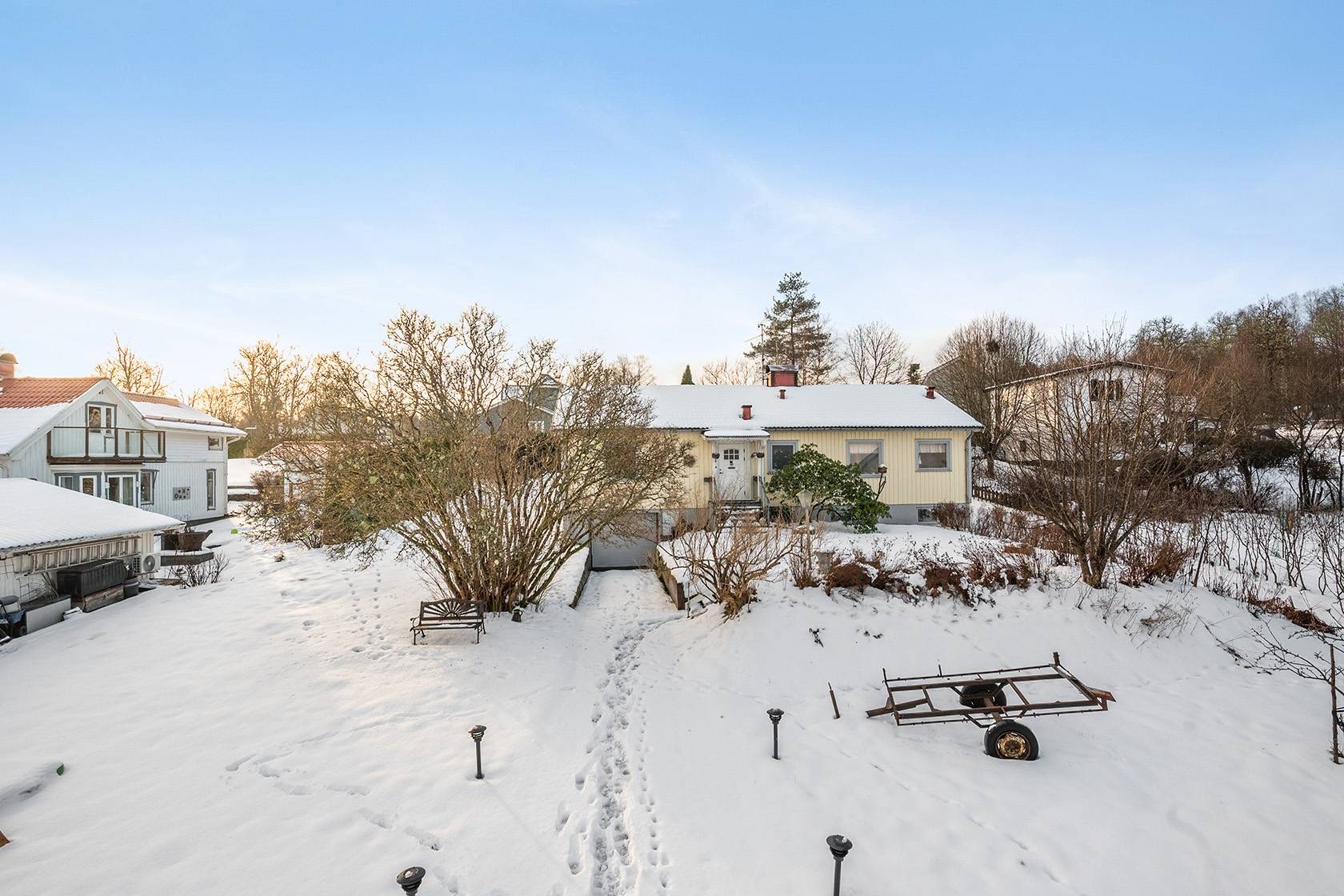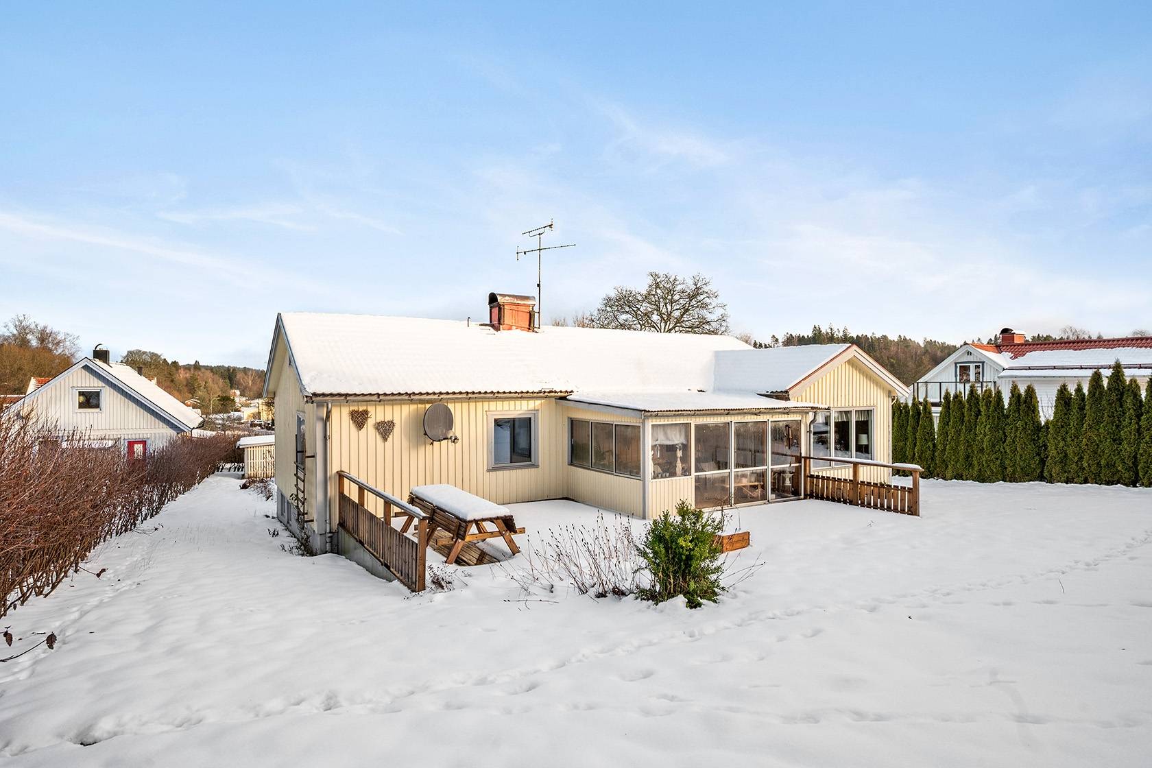 På Villavägen 5 ges du nu tillfälle att förvärva en 1-plansvilla med hel källare. Villan är belägen i hjärtat av den lilla byn Mjöbäck. Baksida är lugn och insynsskyddad till större del – och du har gott om utrymme att sätta din egen personliga prägel här. På entréplan finns kök, badrum, tre sovrum och vardagsrum. I vardagsrummet finns gott om plats för dig och familjen att umgås, spela spel och inta tv-soffan, här är sällskapsytorna generösa. En inglasad altan nås via vardagsrummet och förlänger hemmets ytor under sommarhalvåret – en självklar plats under grillsäsongen då denna i sin tur leder vidare ut till altanen. I källaren finns bra förvaringsutrymmen och garage. Fastigheten säljs med friskrivningsklausul. I närområdet finns fina möjligheter till friluftsliv, med skogar, sjöar och vandringsleder som inbjuder till både avkoppling och aktiviteter året runt. Samtidigt har du smidig tillgång till Svenljunga och Ullared, där du hittar butiker, restauranger och annan service. För barnfamiljer finns skola och förskola inom bekvämt avstånd, vilket gör området extra attraktivt. Skolan som ligger 5 minuter bort med bil i Överlida är nybyggd och öppnade hösten 2024.18 images