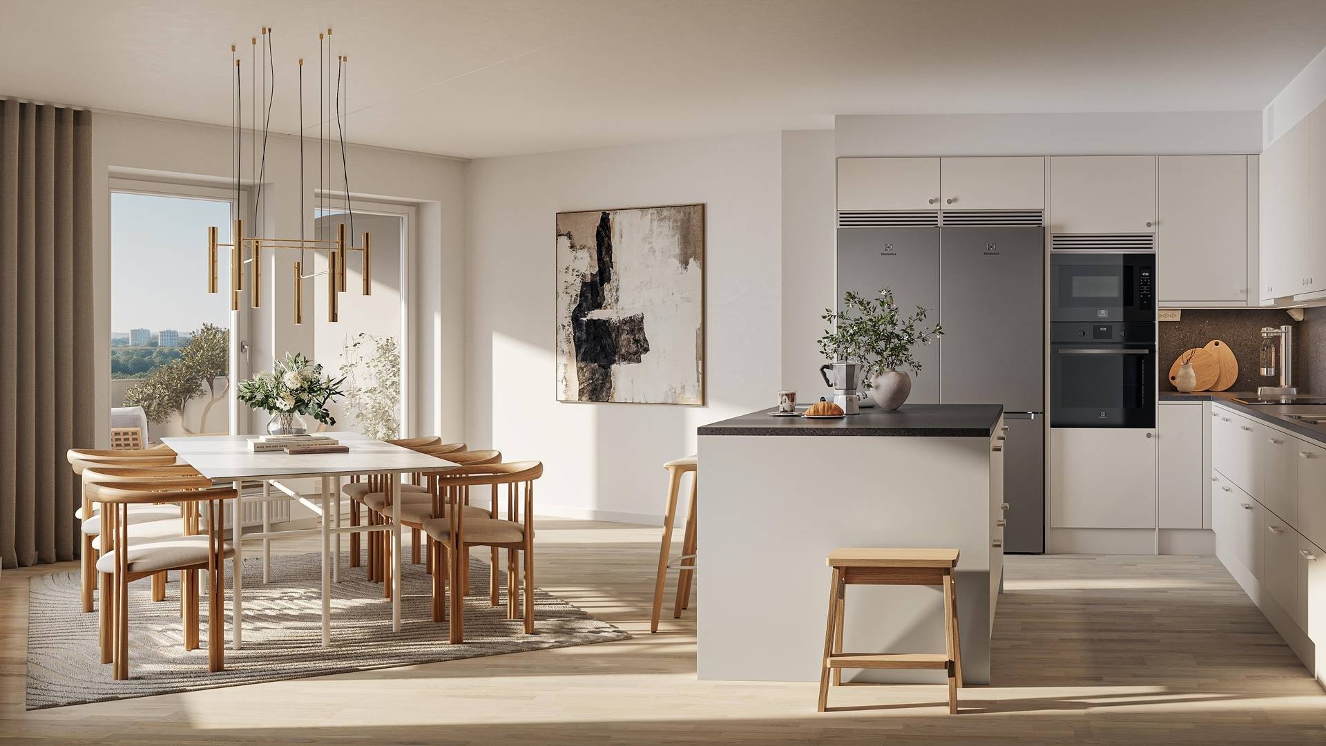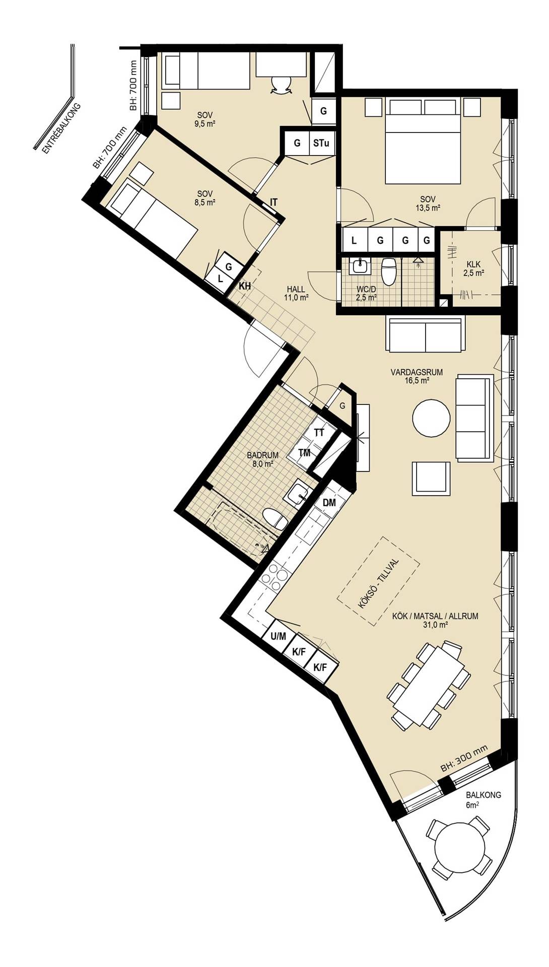 Välkommen till denna generösa och unikt utformade fyrarummare om ca 108 kvm ett hem som erbjuder både rymd, karaktär och moderna bekvämligheter. Den vinklade planlösningen skapar spännande ytor och ett naturligt flöde mellan bostadens sociala och privata delar, vilket ger en trivsam och funktionell helhet. Bostadens hjärta utgörs av det stora köket och matplatsen i öppen anslutning till vardagsrummet. Här skapas en social och inbjudande miljö med gott om plats för både vardagsliv och större sammankomster. De generösa fönsterpartierna ger ett härligt ljusinsläpp och förstärker den luftiga känslan. Från sällskapsytorna nås den rymliga balkongen, en perfekt plats för måltider utomhus eller avkoppling under årets varmare månader. Lägenheten erbjuder tre sovrum i bra storlek, vilket ger flexibilitet för familjeliv, gästrum eller hemmakontor. Det större sovrummet kompletteras av goda förvaringsmöjligheter, och de övriga rummen kan enkelt anpassas efter behov. Bostaden har ett helkaklat badrum utrustat med dusch/badkar och tvättmöjligheter samt en separat WC en praktisk lösning för en aktiv vardag. Hallen binder samman bostaden på ett funktionellt sätt och erbjuder goda förvaringsmöjligheter. Här erbjuds ett modernt och rymligt hem med spännande arkitektur, generösa sällskapsytor och en trivsam balkong perfekt för dig som söker ett bekvämt boende med både karaktär och livskvalitet.19 images