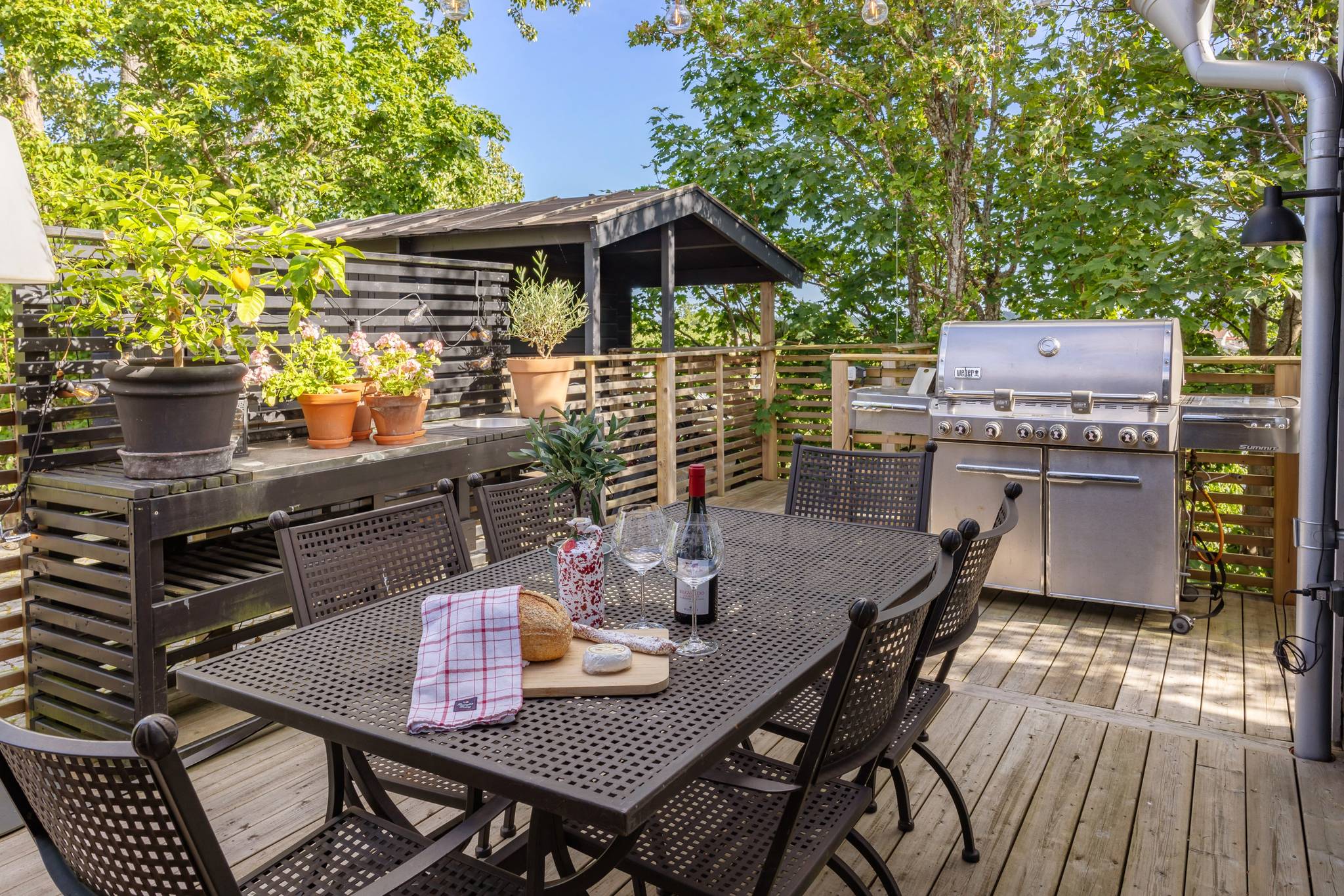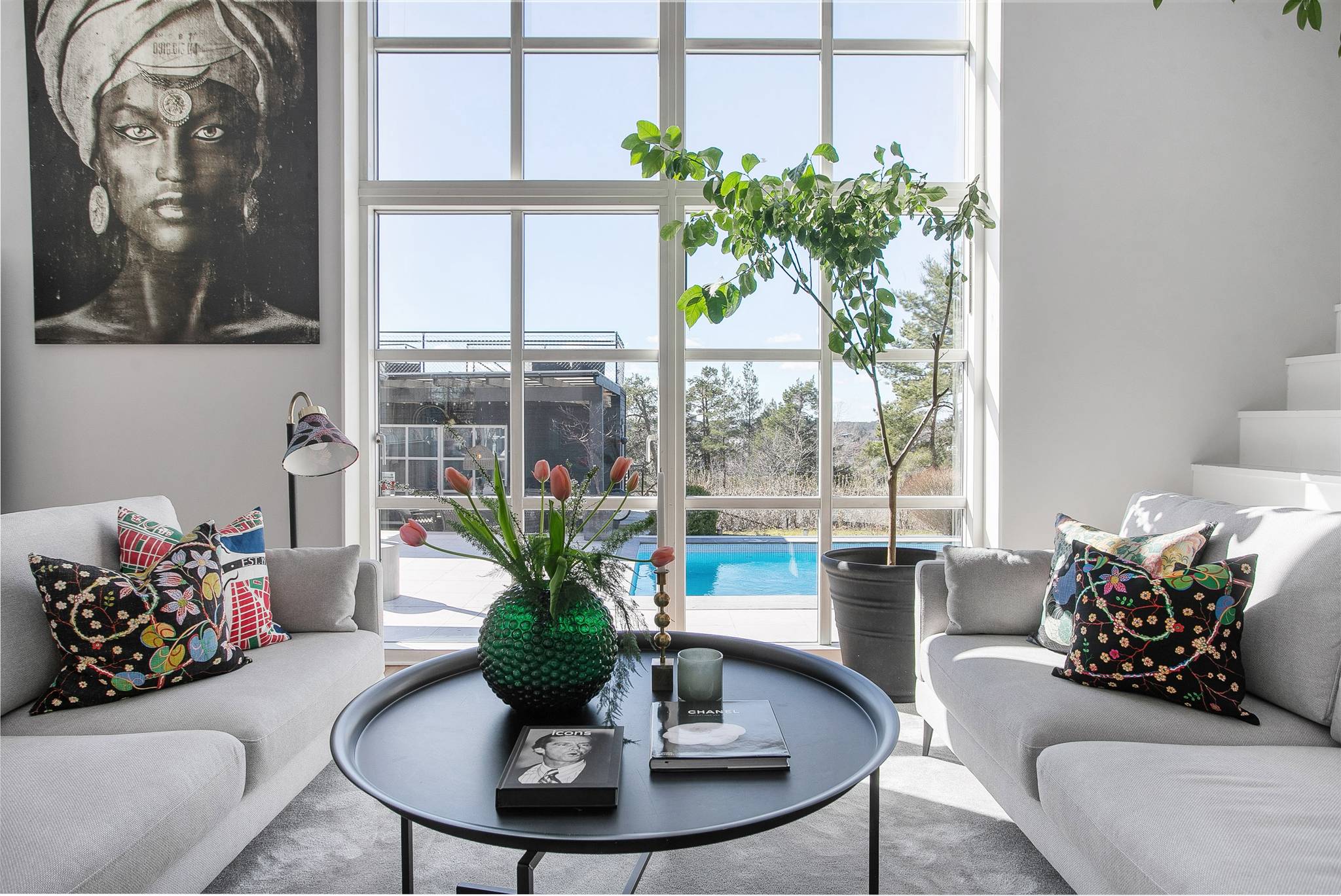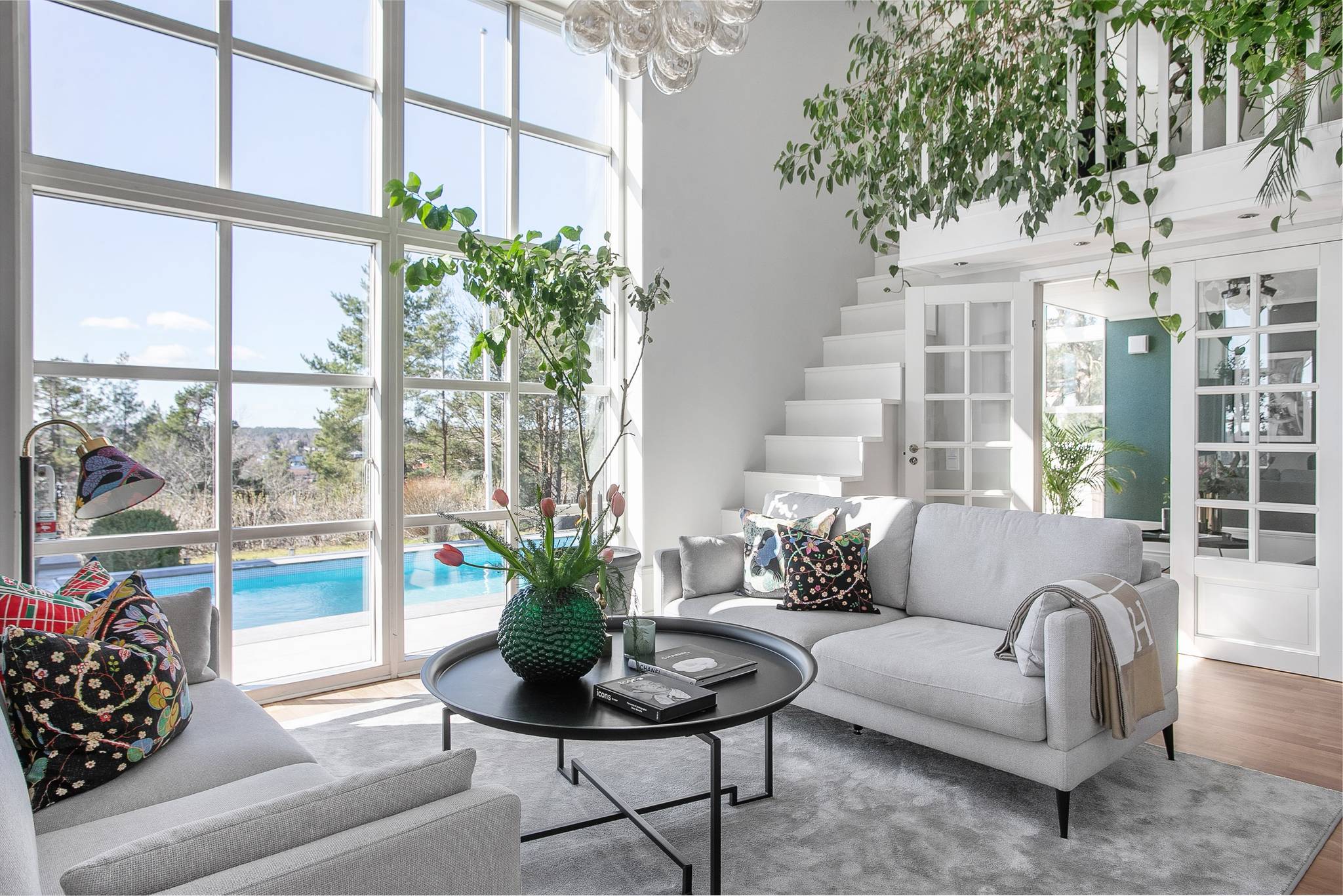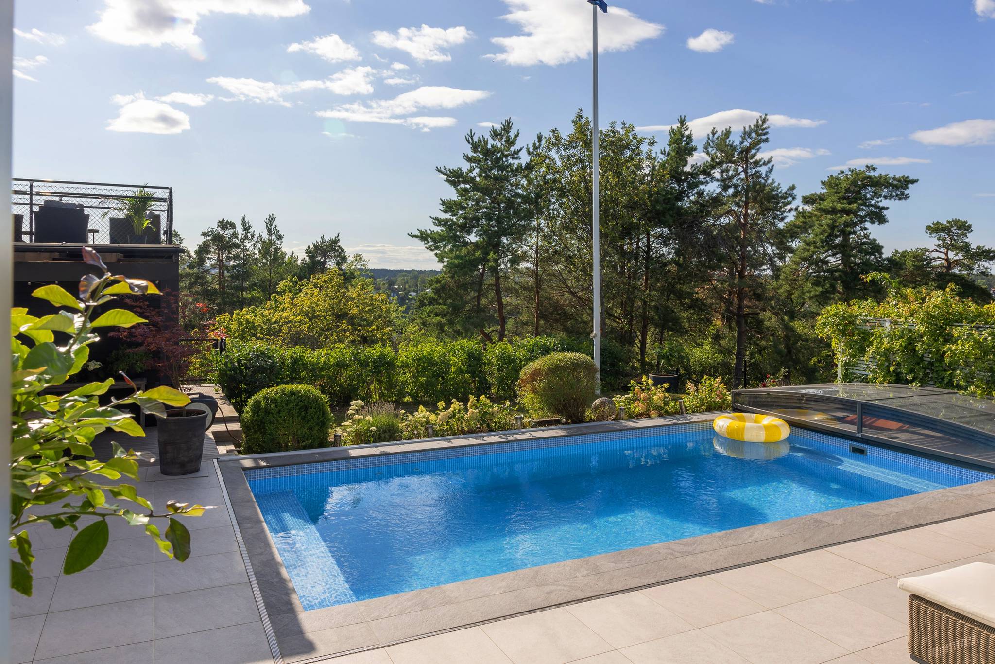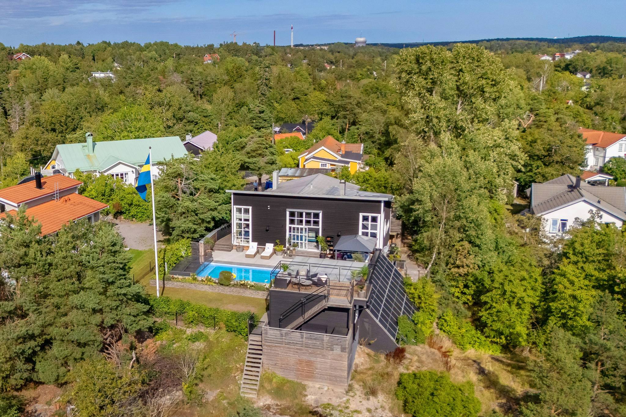 Välkomna till en spännande och helt unik villa, supersnyggt och storslaget tillbyggd, med ett helt rekreationsområde med pool och massor av uteplatser för olika tillfällen och användningsområden – soffhäng, grillkvällar, frukostmys, poolpartyn, trädgårdsfester med mera. Detta är huset för den stora familjen som älskar att umgås, har behov av många rum och höga krav på design och kvalitet i varje detalj. Allt i utmärkt läge, högt upp med makalös utsikt och närhet till både storstad och skärgård.49 images