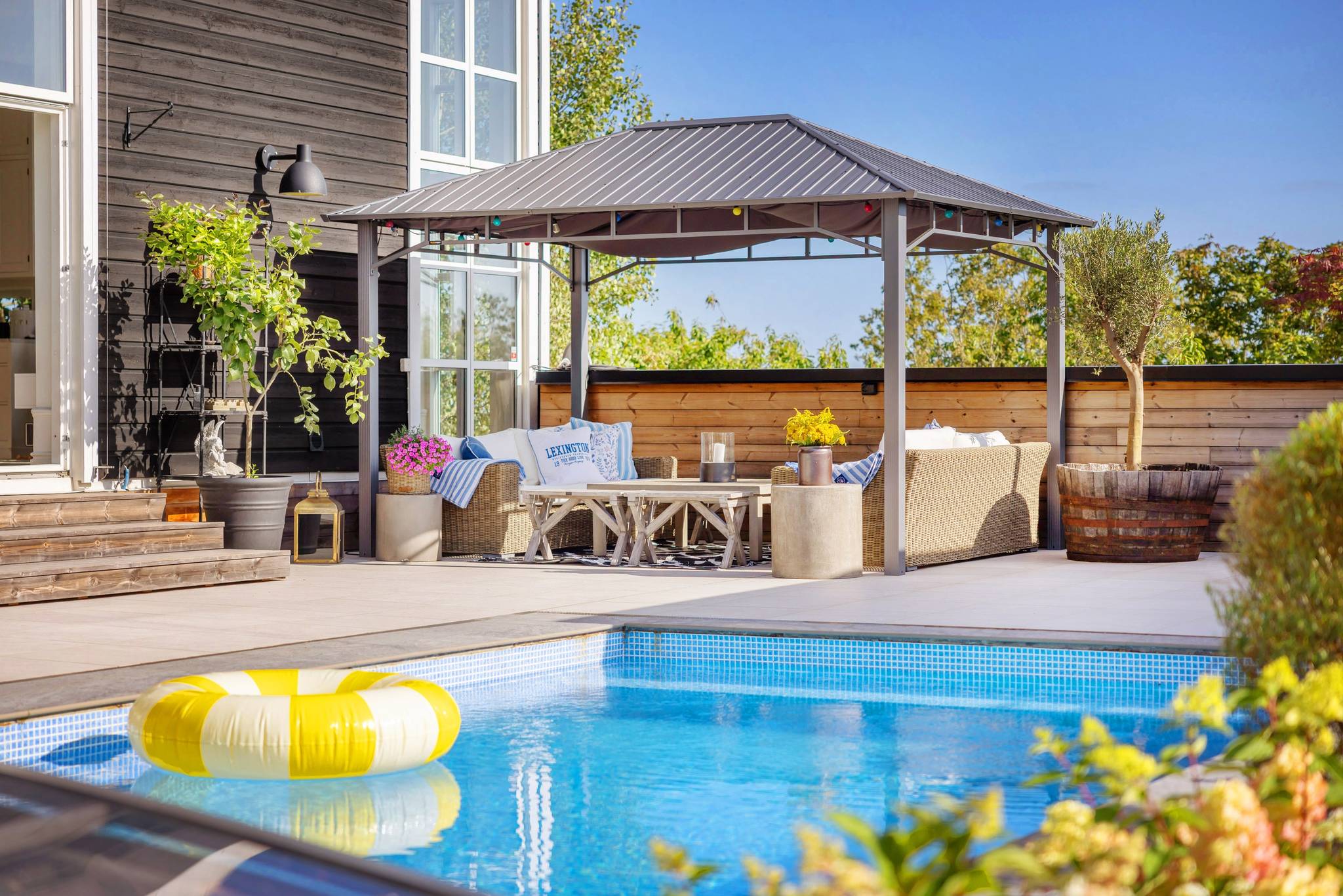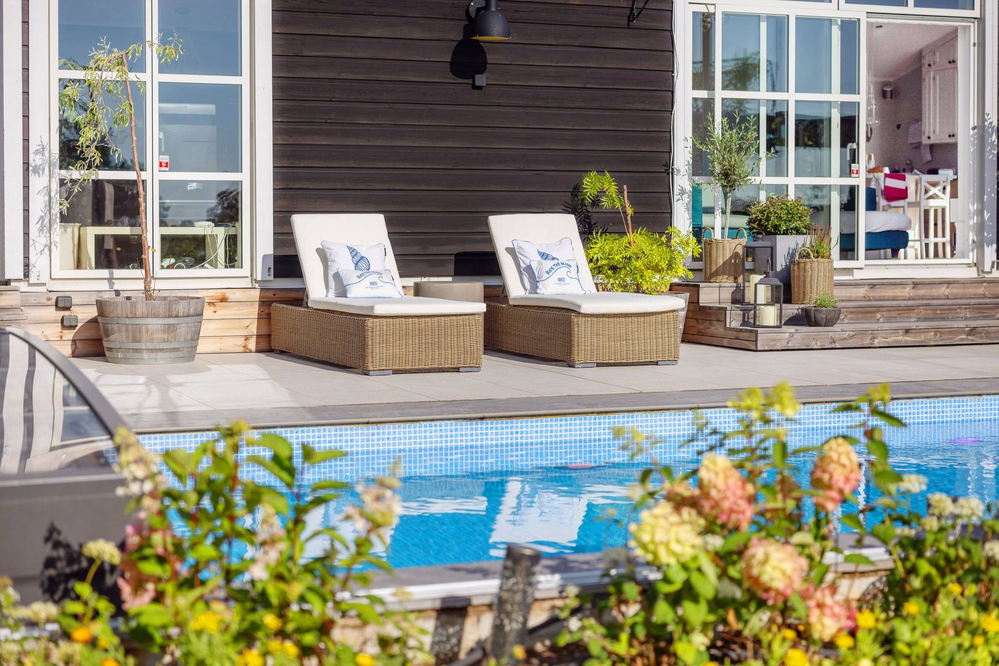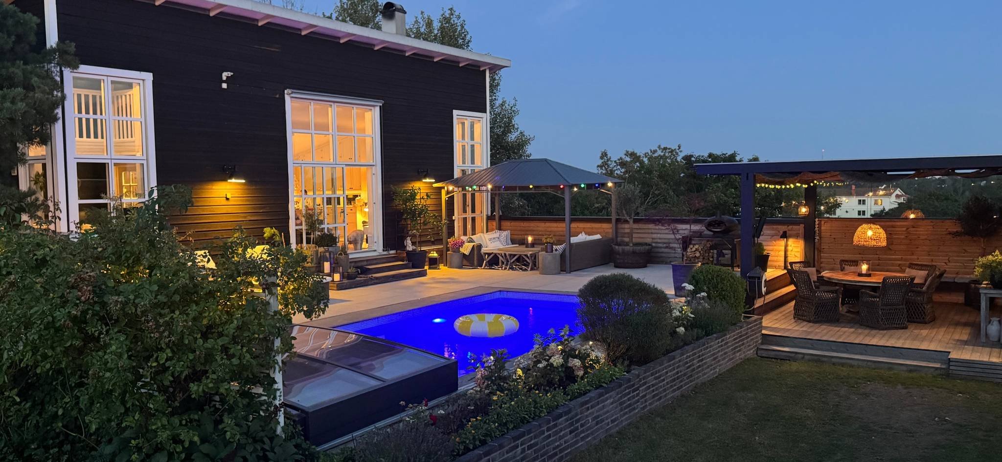 Välkomna till en spännande och helt unik villa, supersnyggt och storslaget tillbyggd, med ett helt rekreationsområde med pool och massor av uteplatser för olika tillfällen och användningsområden – sofMore...