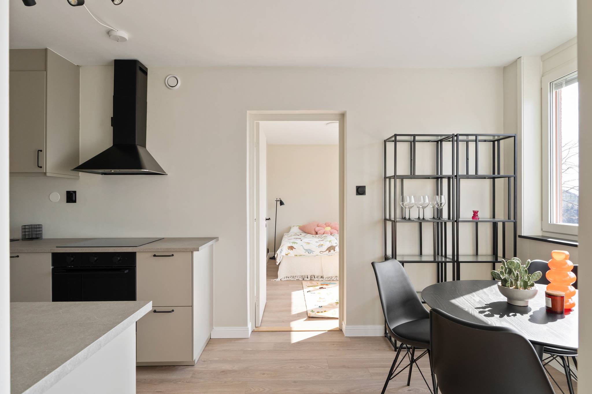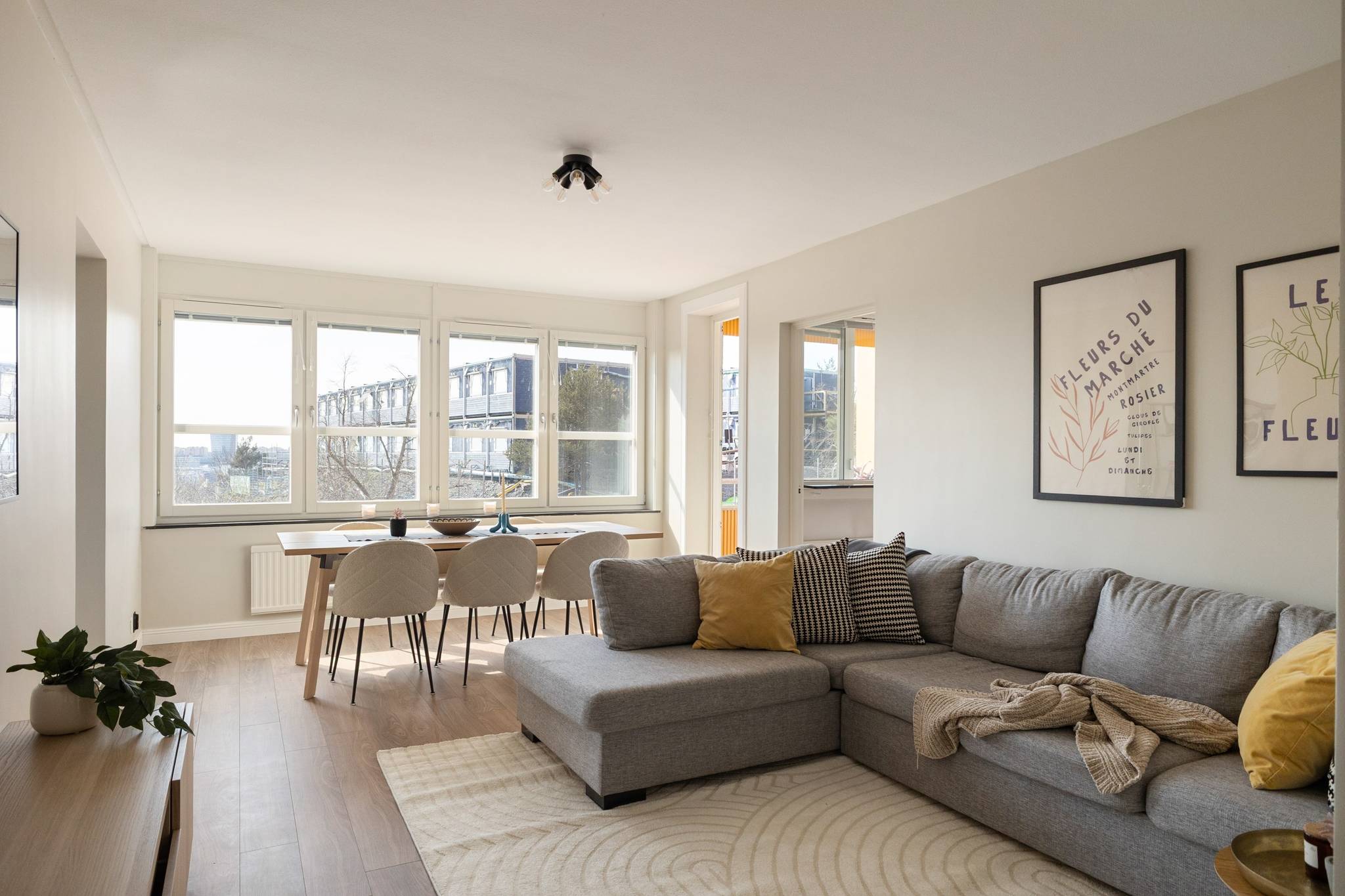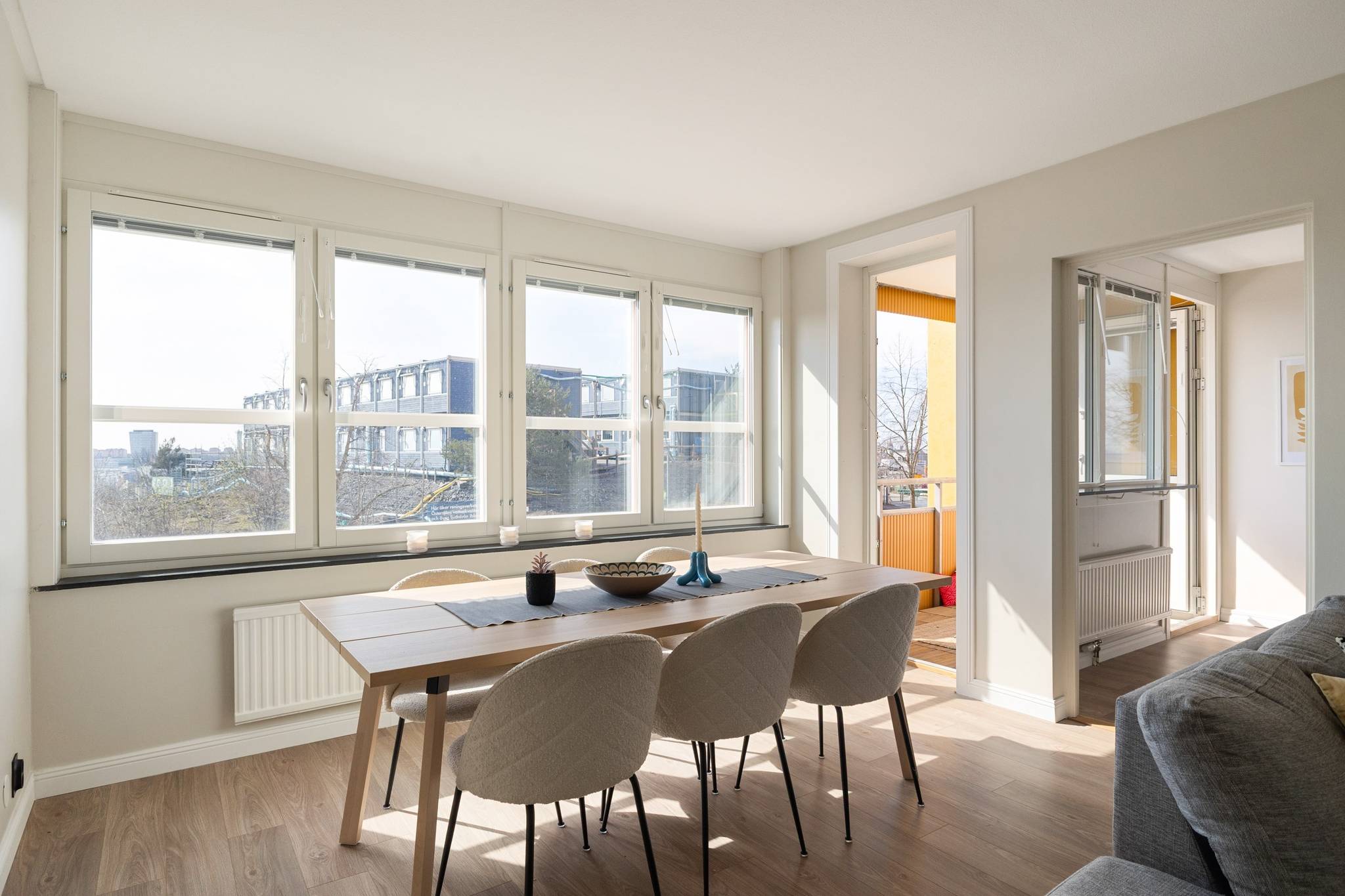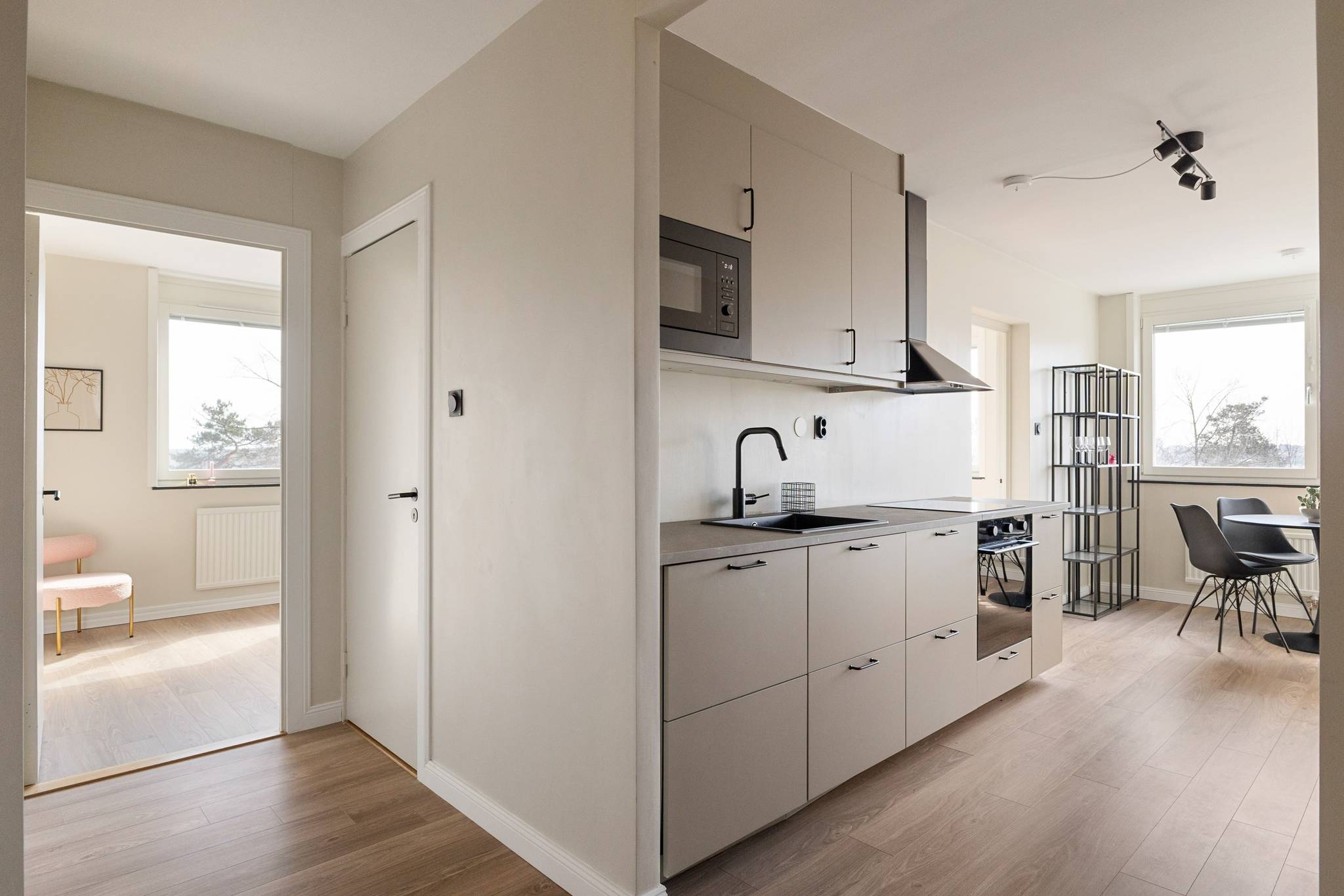 Stilren och välplanerad fyra om 92 kvm med generösa ytor, stora fönsterpartier och balkong med öppen utsikt. En omsorgsfullt renoverad bostad i högre standard där materialval och utförande håller en genomgående hög nivå. Planlösningen präglas av fyra rum i fil där ett sovrum, kök, vardagsrum och master bedroom binds samman via en öppnad passage, vilket skapar ett unikt flöde och en luftig känsla samtidigt som varje rum behåller sin tydliga funktion. Köket är modernt utformat med bra arbetsytor, full maskinell utrustning och god förvaring. Vardagsrummet rymmer enkelt både soffgrupp och matsalsdel och har, tillsammans med master bedroom, direkt access till balkongen. Ytterligare ett rogivande sovrum i bra storlek ger flexibilitet för familj, hemmakontor eller gästrum. Master bedroom i lugnt läge med god förvaring och utgång till balkongen. Bostaden erbjuder även ett stilrent badrum samt separat gäst-wc. Genomgående ljusa ytskikt, enhetliga golv och väl genomtänkta detaljer förstärker det harmoniska helhetsintrycket och gör bostaden inflyttningsklar. Brf Henriksdalshöjden är en stabil och välskött förening med ett aktivt underhållsarbete och tydligt fokus på energieffektivisering. Belåningen uppgår till cirka 14 700 kr/kvm och soliditeten ligger runt 44 %, vilket tillsammans med genomförda investeringar och kontrollerad kostnadsbild skapar en trygg och långsiktigt hållbar ekonomi .25 images