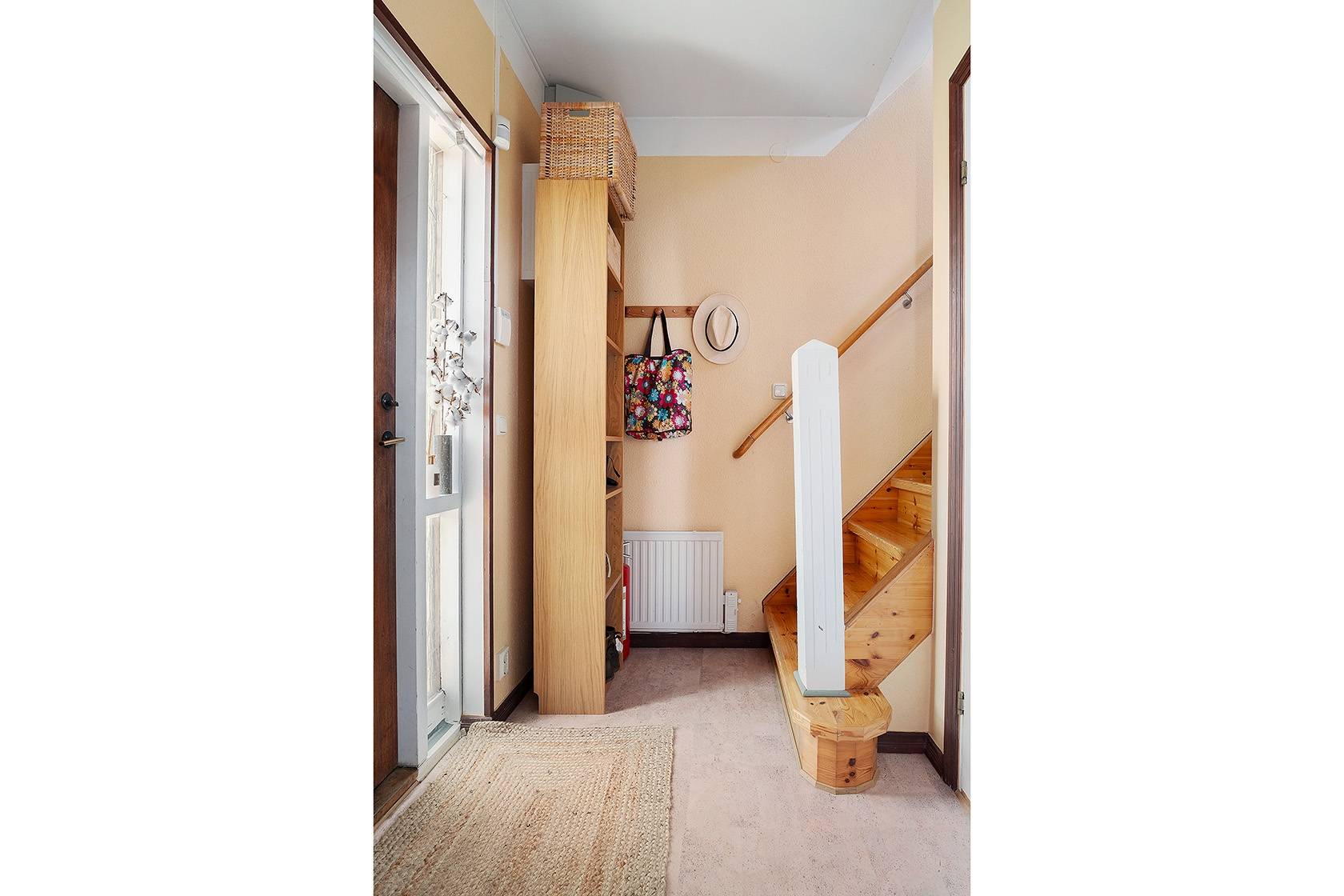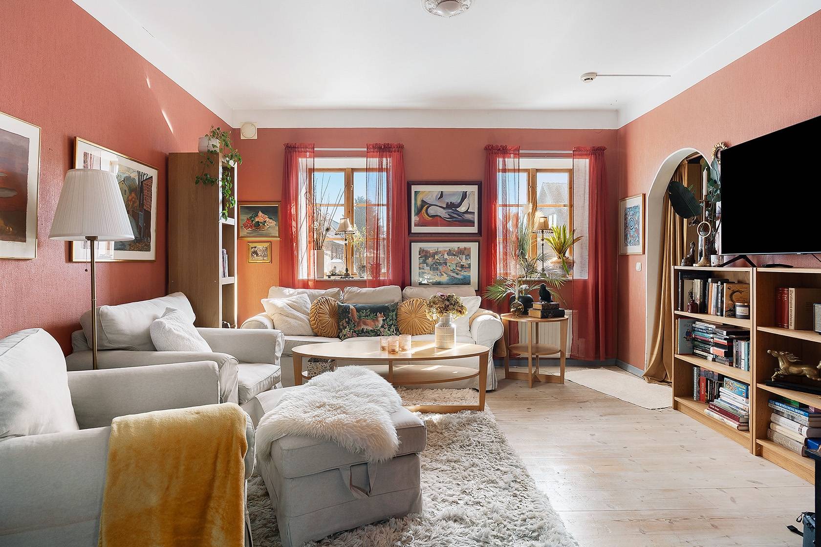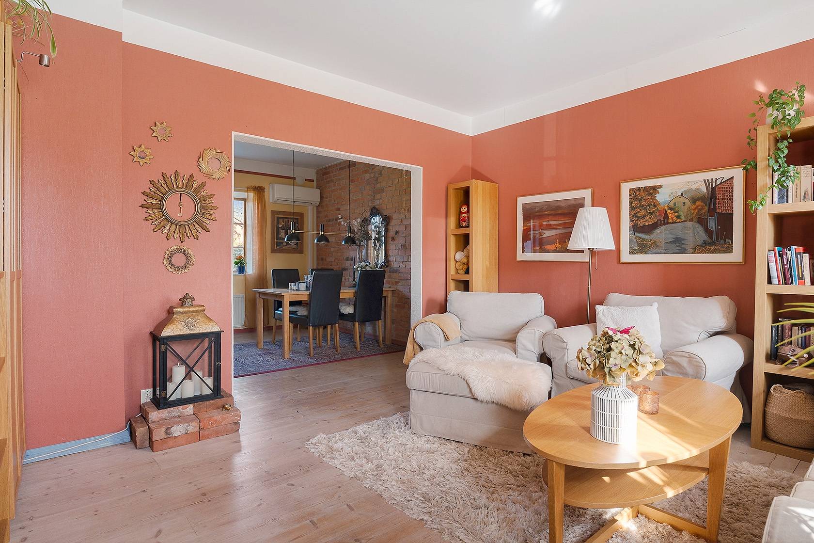 Charmigt vitputsat parhus från 1909 om 73 kvm i 1½ plan med centralt läge och lummig trädgård. Entréplan med öppen planlösning mellan kök, matrum och vardagsrum, brädgolv, takbjälkar och vackra spegeldörrar. Badrum med dusch. Ovanvåning med två sovrum och toalett samt trappa till mysigt sovloft. Ett hemtrevligt boende med karaktär och sociala ytor.33 images