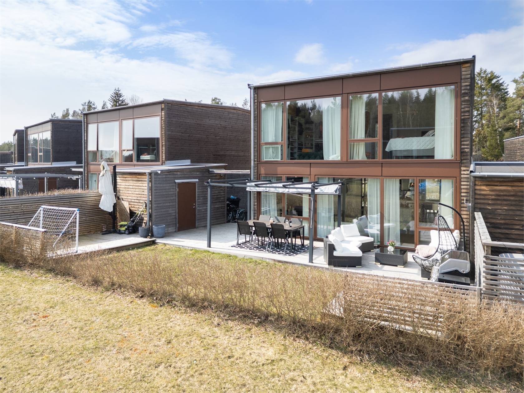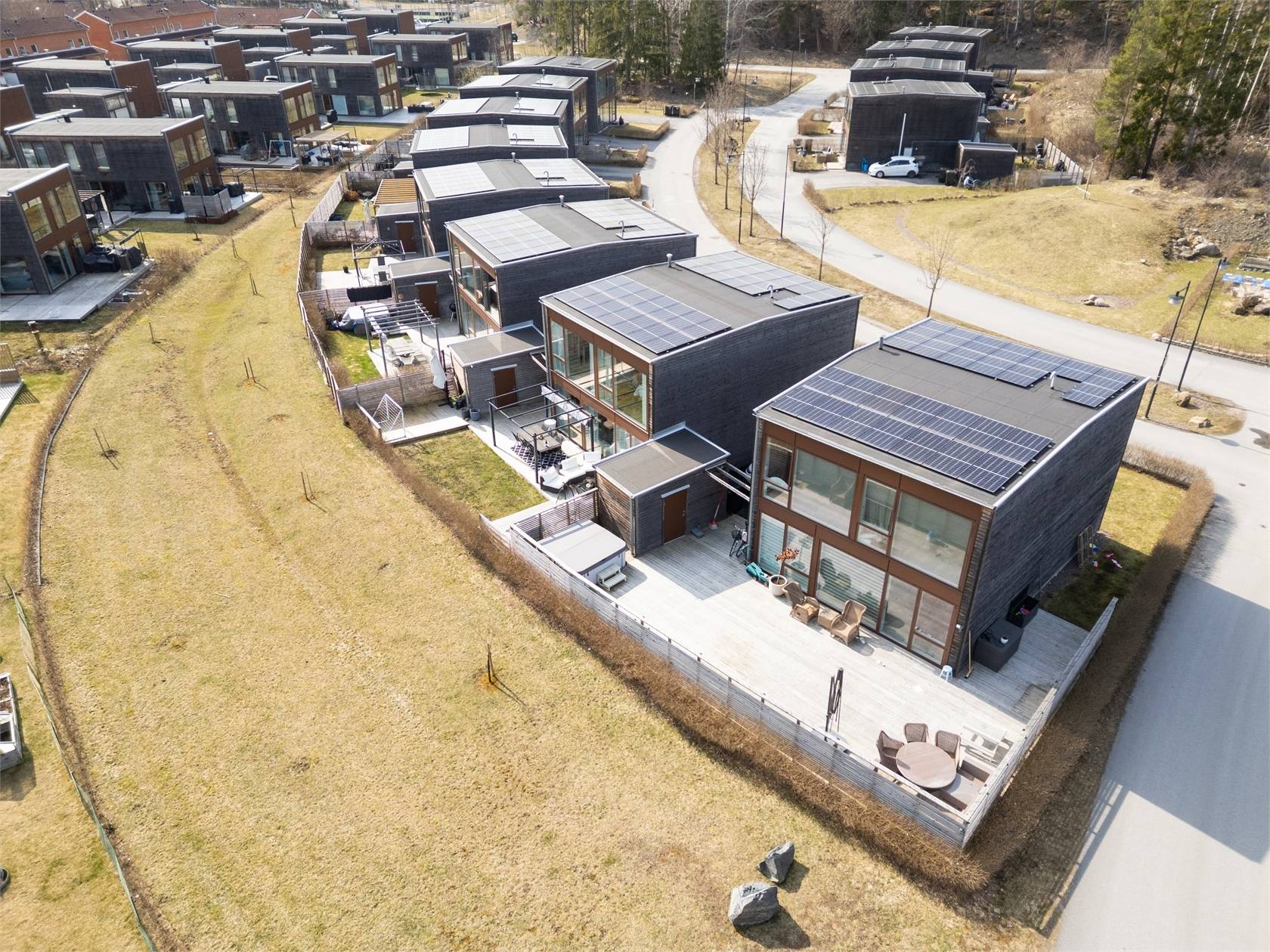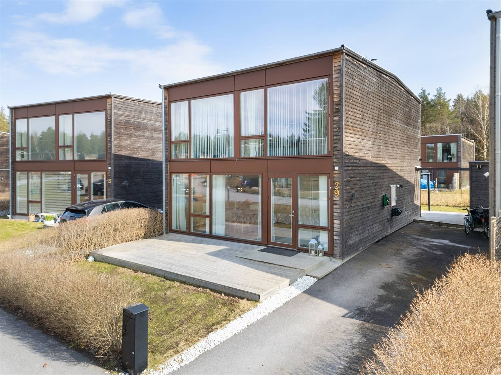 På Bråta Allé 29 ges nu chansen att förvärva ett mycket stilfullt hus i modern design som karaktäriseras av generös takhöjd, fönsterpartier från golv till tak för maximalt ljusinsläpp och ljusa boningsytor. Entréplanet erbjuder öppen planlösning som lämpar sig utmärkt för umgänge och middagsbjudningar. Två stora uteplatser ger ytterligare utrymme under årets varma månader. På promenadavstånd nås mataffär, skola och allmänna kommunikationer och i området finns förskola.39 images
