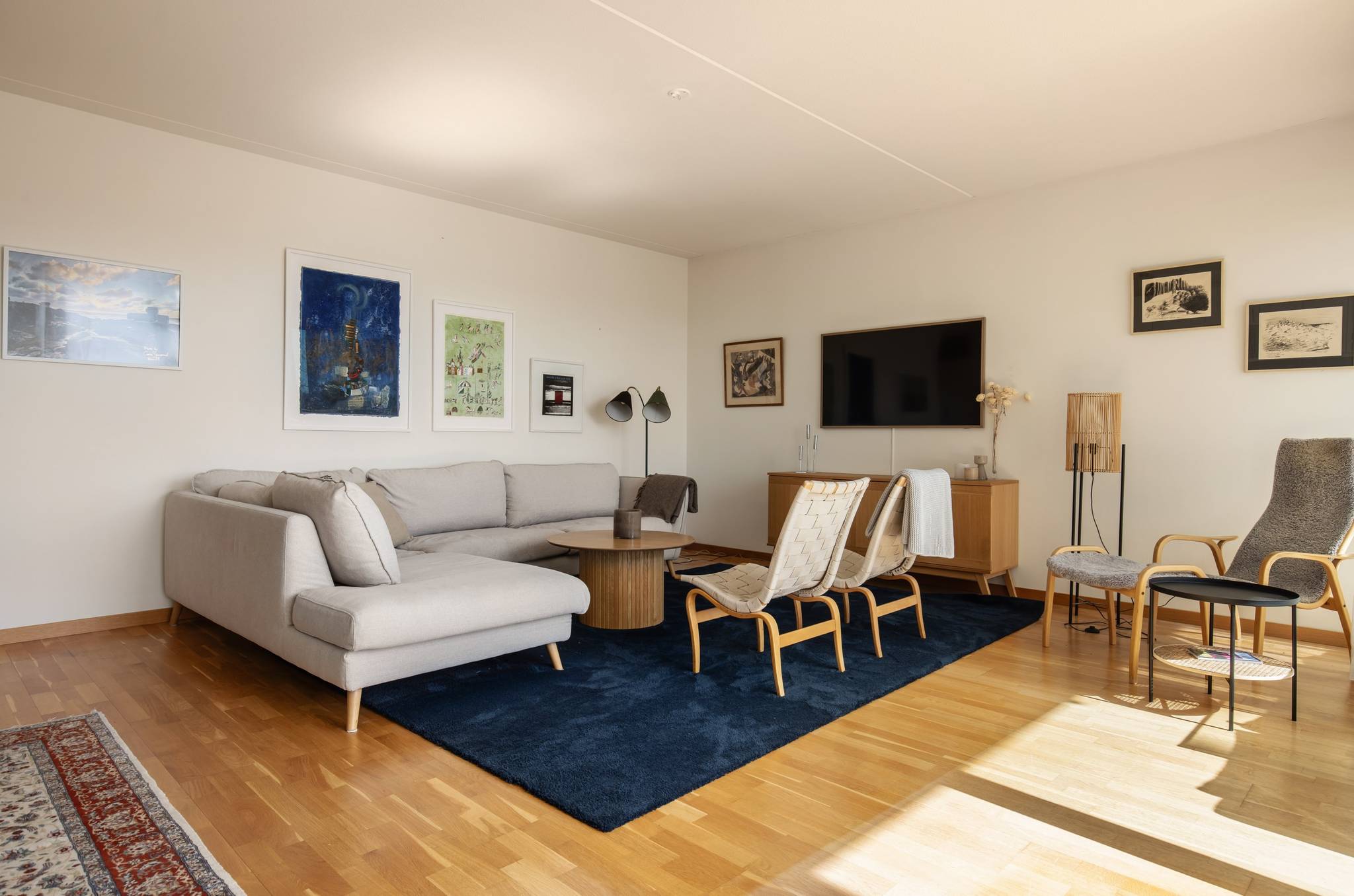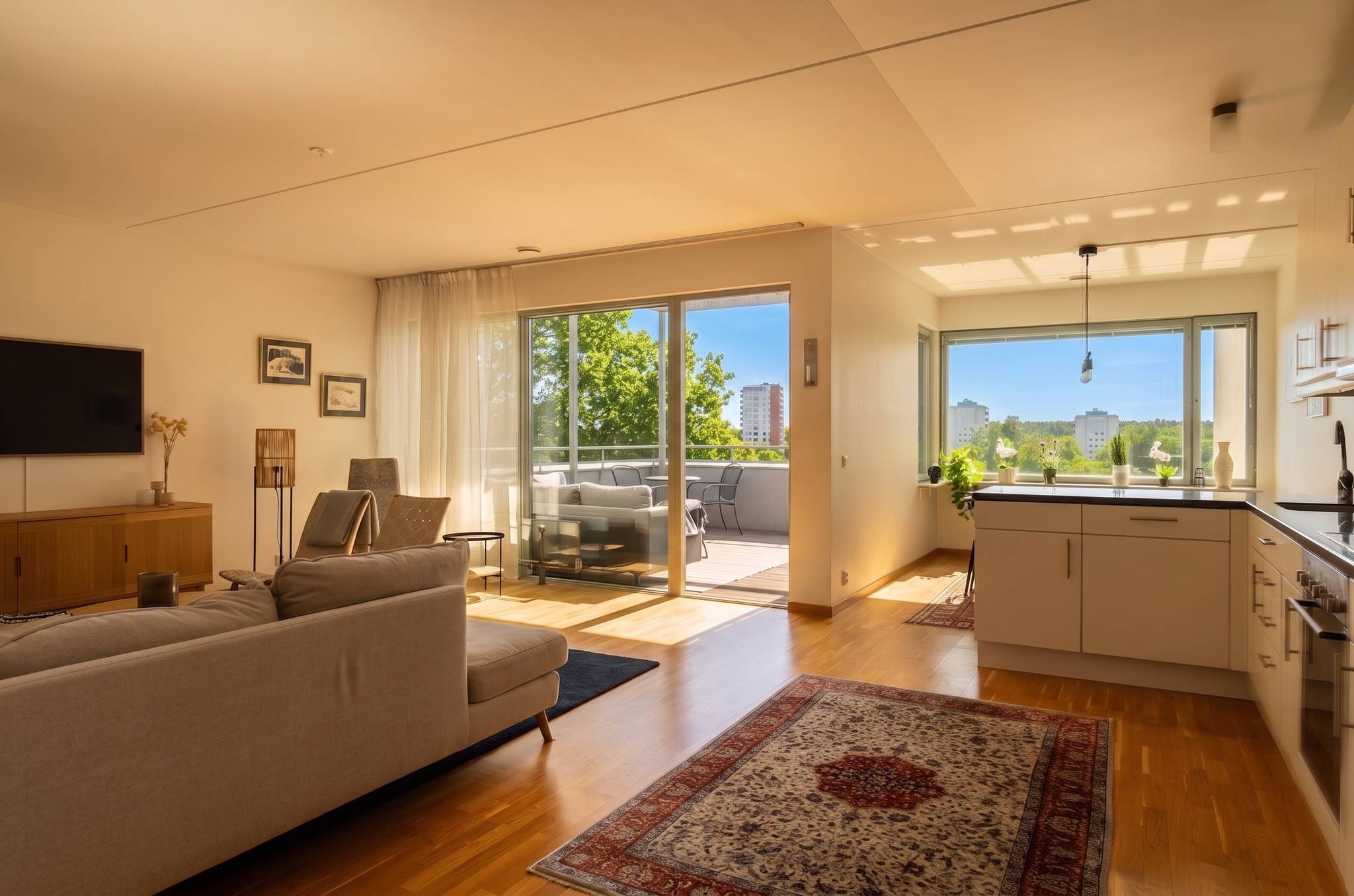 Exklusiv tvåa högst upp i arkitektritat hus med fantastisk takterrass och vy över takåsarna! Varmt välkommen till denna fantastiskt fina 2a högst upp i det arkitektritade huset av Kristian Gullichsen. Bostaden erbjuder en perfekt kombination av närhet till naturen, vattnet, shopping och smidig access till Stockholms innerstadspuls. Läget, den kommande tunnelbanan och det närliggande utbudet gör att bostaden passar alla livsstilar. - Sällan till salu - Stor takterrass i söderläge - Högst upp i huset - Väl insynsskyddat - Öppen planlösning - Stora fönsterpartier - Vyer över takåsarna - Tvättmaskin och torktumlare i bostaden - Fast p-plats samt flera elbilsplatser - Gratis gästparkering på innergården Lägenheten håller en genomgående hög standard och är i mycket gott skick. Den öppna planlösningen skapar generösa sociala ytor – perfekt för både vardagsliv och när du vill bjuda över vänner eller familj. När du kliver in i bostaden möts du av en välkomnande hall med goda avhängningsmöjligheter. Redan från hallen möts du av ett härligt ljusinsläpp från de stora fönsterpartierna i vardagsrummet, som tillsammans med köket ligger i öppen planlösning. Fönstren sträcker sig längs bostadens södersida och bjuder på rikligt med ljus, minimal insyn och vackra vyer över takåsarna. Det moderna köket är fullt maskinellt utrustat, har en generös köksö och erbjuder mycket goda arbets- och förvaringsytor. Från vardagsrummet nås bostadens verkliga höjdpunkt – den stora takterrassen i bästa söderläge. Här kan du njuta av sol hela dagen, sociala tillställningar eller lugna stunder med en oslagbar utsikt. Sovrummet erbjuder en rofylld och avkopplande miljö med gott om förvaring i inbyggda garderober. Badrummet är stilrent, helkaklat och utrustat med dusch, tvättmaskin och torktumlare. Till lägenheten hör ett förråd. Utanför huset finns en trevlig uteplats med grill som kan nyttjas under sommarens härliga dagar. Perfekt läge i Finntorp med närhet till både natur, vatten, kommunikationer och stadens puls. Digital redigering av bilder förekommer.31 images