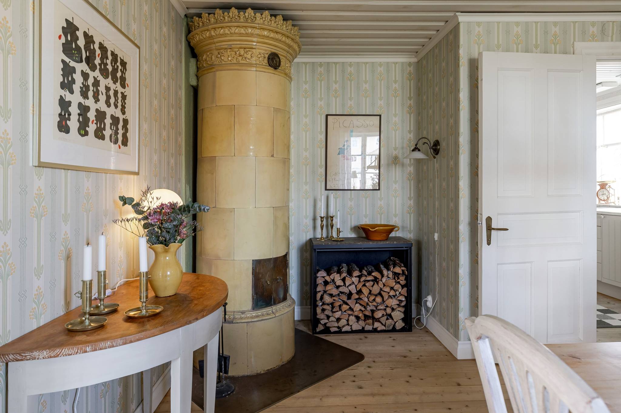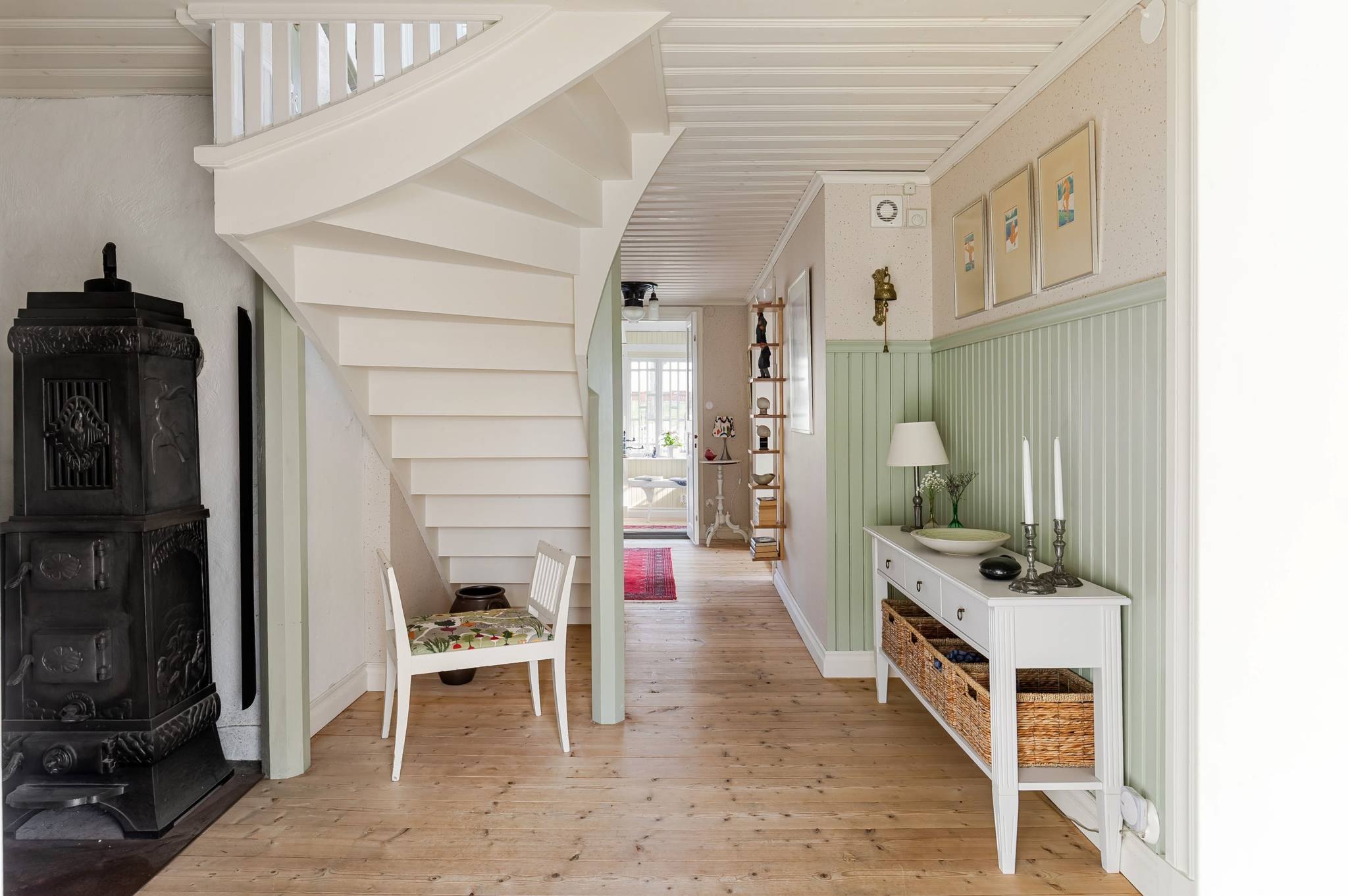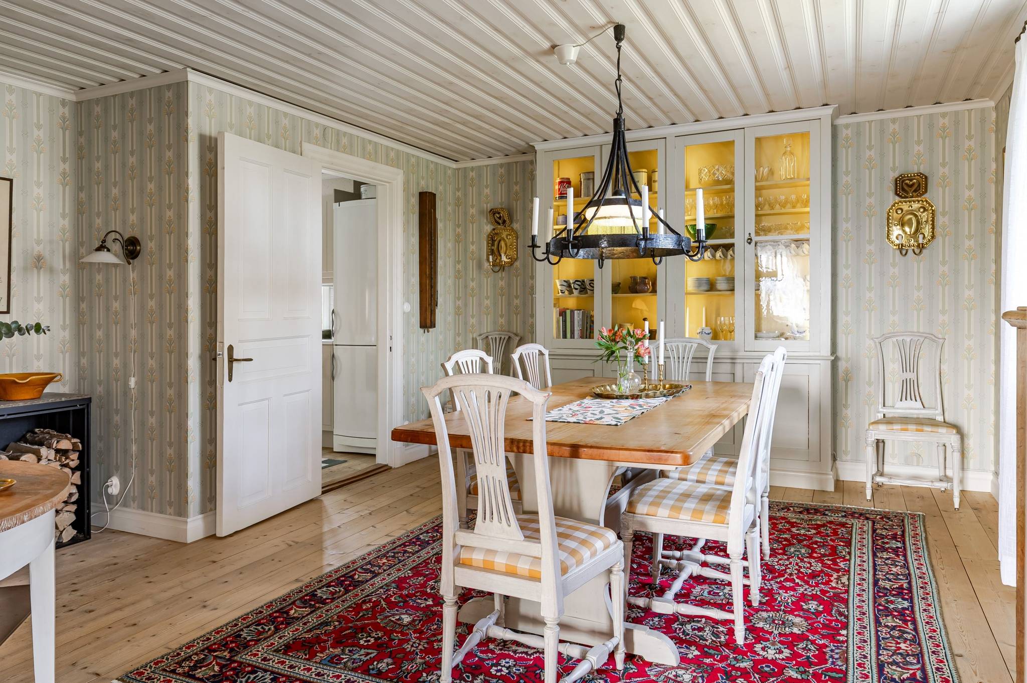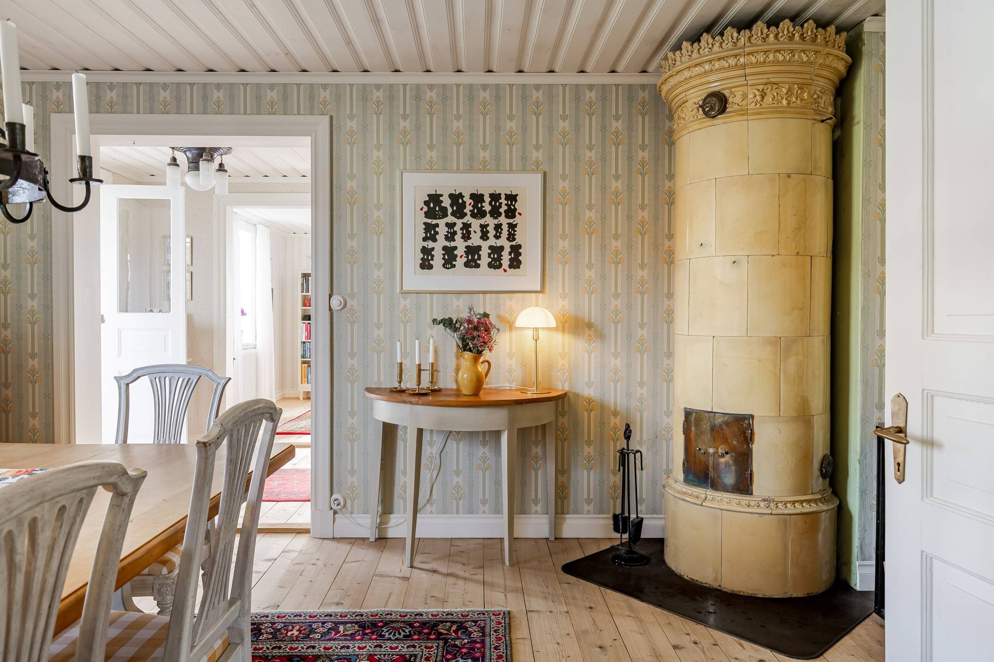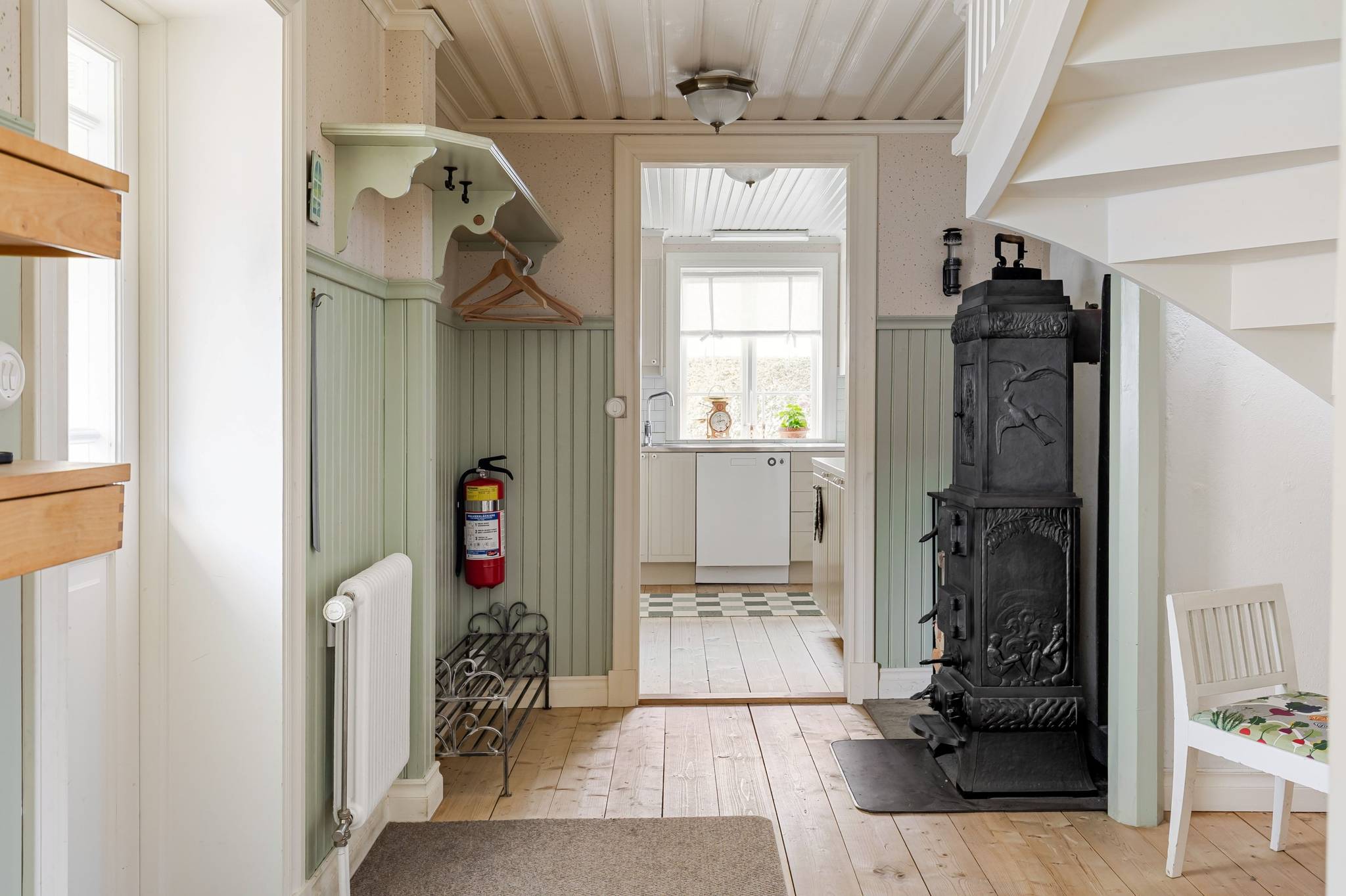 Ett hem där omtanke och hantverk får tala för sig själva. Ett vackert och välskött hus som varsamt tagits om hand under många år med fokus på det genuina, hållbara och hjärtliga. Sedan 2001 har huset steg för steg renoverats med stor respekt för dess ursprung. Här har inget lämnats åt slumpen. Med bakgrund som snickare och byggnadsingenjör har tidigare ägare med säker hand och känsla återskapat detaljer i byggnadsvårdsmässig anda. Fasaden med sin snickarglädje följer traditionen i Bergkvara, och snickerier samt golv är framtagna i samarbete med lokalt sågverk efter äldre förlagor. Redan vid första anblick förstår man att detta är något särskilt. Och känslan förstärks när du kliver in genom trädgården, en varm och inbjudande plats där huset bär spår av omsorg och kärlek. Entréplanet bjuder på ett trivsamt kök med närhet till en mysig matsal där kakelugnen blir hemmets naturliga samlingspunkt. Den återskapade glasverandan ger ett mjukt ljus och en stillsam plats att slå sig ner på. Här finns också ett ombonat vardagsrum, ett sovrum och ett badrum, allt med samma genomgående känsla av hemtrevnad. En trappa upp möts du av ett ljust allrum med plats för både vila och umgänge. Från balkongen skymtar havet och södra Öland i horisonten, en vy som skiftar med årstiderna. Här finns även två sovrum, varav det ena med havsutsikt. Trädgården är en historia för sig, en prunkande rosenträdgård med mjuka, svängda singelgångar som leder dig mellan olika rum och platser. På innergården väntar en skyddad uteplats under segel, där planket skärmar av från havsvindarna. När kvällen blir sval finns det charmiga grillhuset att dra sig tillbaka till, en plats som förlänger sommarens alla stunder. På tomten finns också ett gårdshus om cirka 25 kvm med både verkstad och grillhus, liksom ett fristående uthus med gästrum, redskapsbod och vedförråd. Här finns gott om utrymme för både praktiska behov och egna idéer. Läget är rofyllt med närhet till havet. Badmöjligheter finns i Dalskär, och många i trakten söker sig till Badudden, en uppskattad plats längst ut på udden, bara en kort promenad bort. Det här är inte ett perfekt tillrättalagt hem, det är något bättre. Ett hus som levts i, vårdats och älskats. Ett hem att trivas i, växa i och tycka om, år efter år.72 images