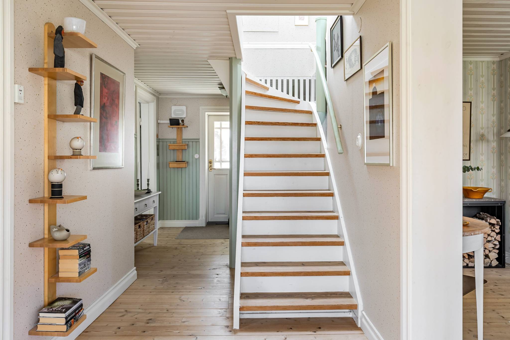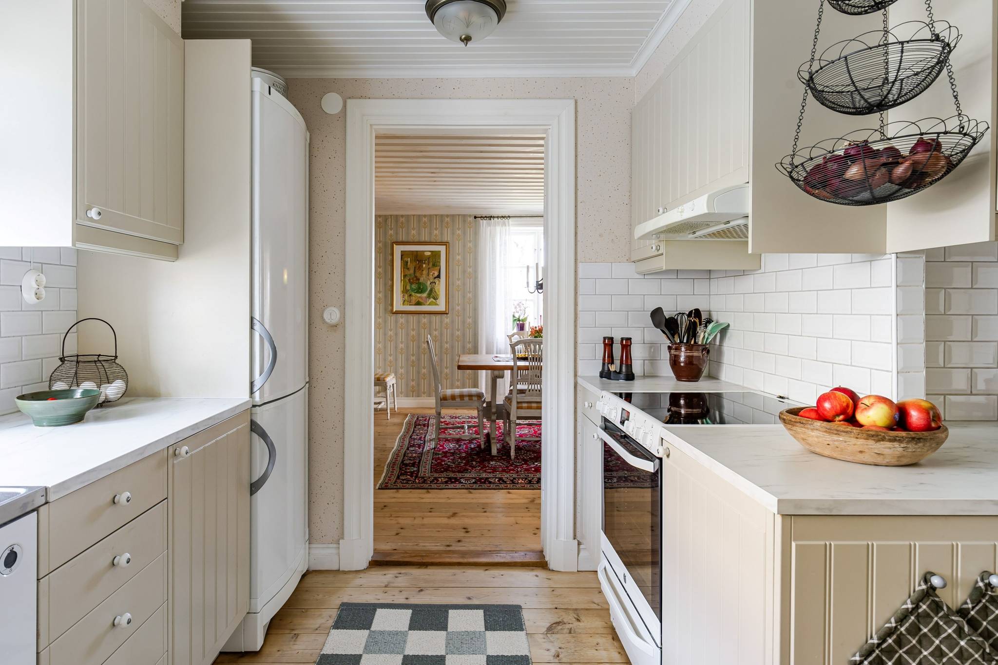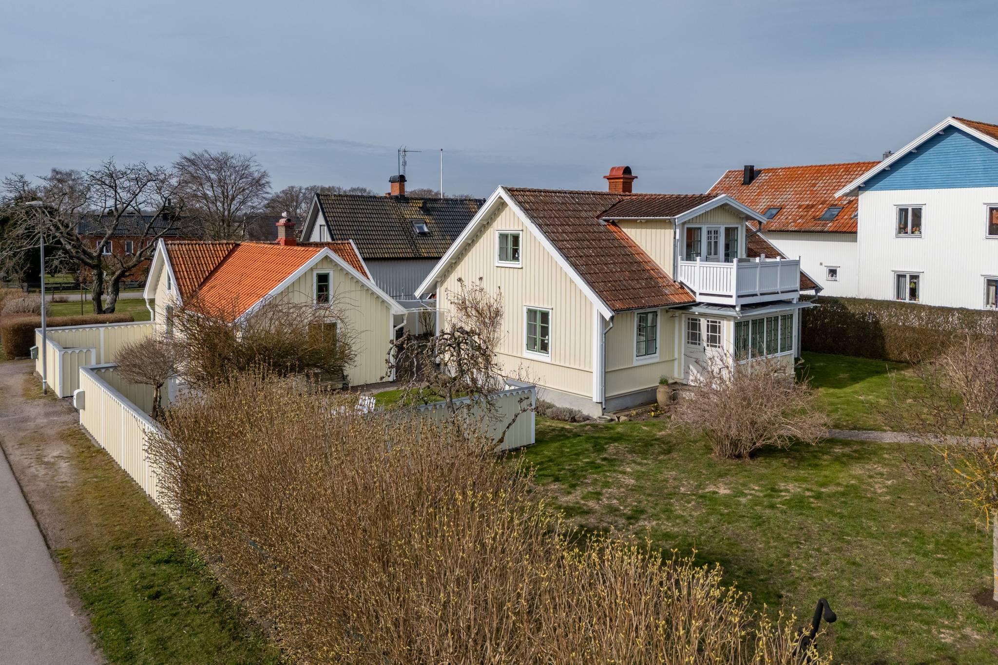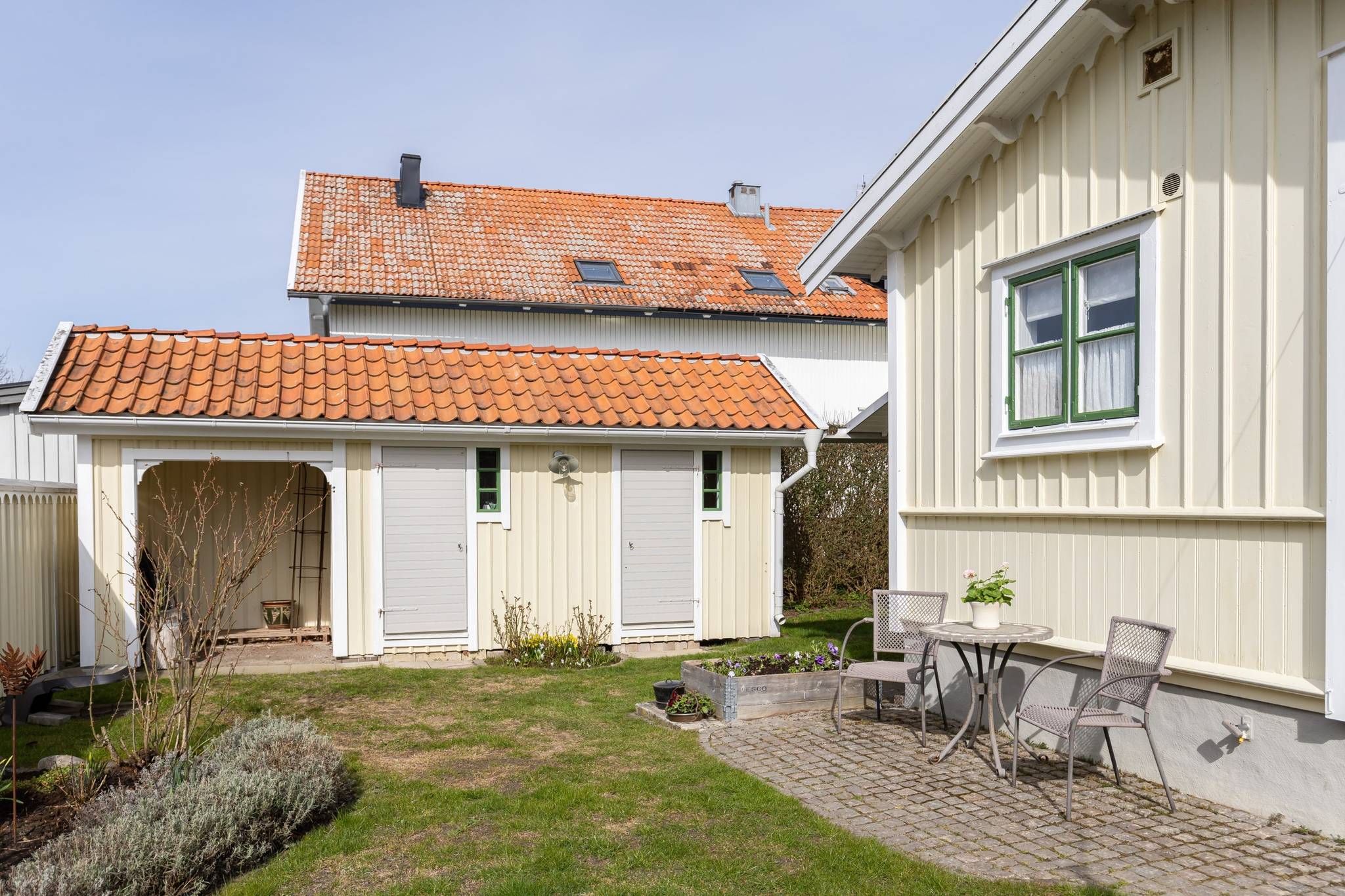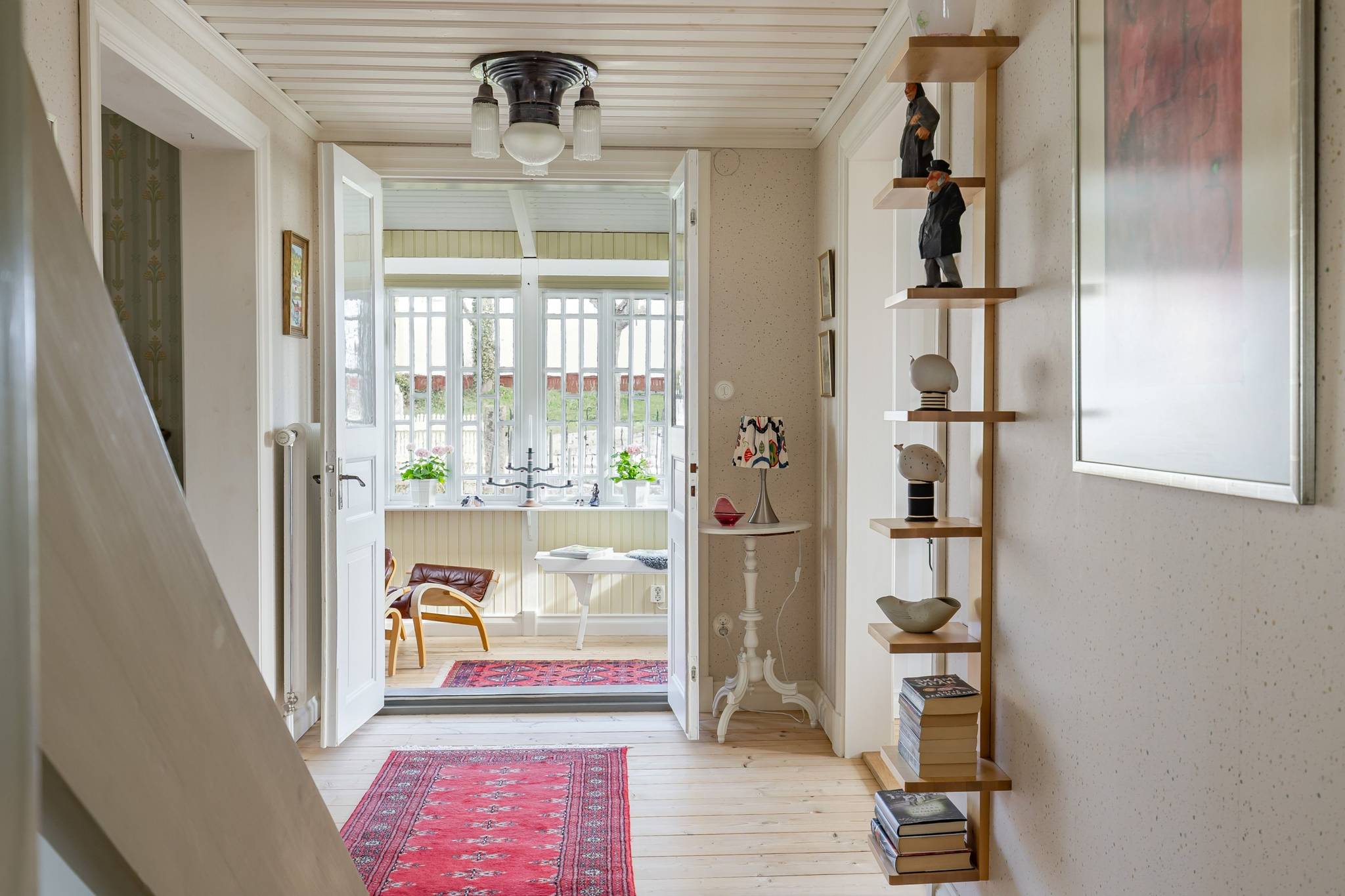 Ett hem där omtanke och hantverk får tala för sig själva. Ett vackert och välskött hus som varsamt tagits om hand under många år med fokus på det genuina, hållbara och hjärtliga. Sedan 2001 har huset steg för steg renoverats med stor respekt för dess ursprung. Här har inget lämnats åt slumpen. Med bakgrund som snickare och byggnadsingenjör har tidigare ägare med säker hand och känsla återskapat detaljer i byggnadsvårdsmässig anda. Fasaden med sin snickarglädje följer traditionen i Bergkvara, och snickerier samt golv är framtagna i samarbete med lokalt sågverk efter äldre förlagor. Redan vid första anblick förstår man att detta är något särskilt. Och känslan förstärks när du kliver in genom trädgården, en varm och inbjudande plats där huset bär spår av omsorg och kärlek. Entréplanet bjuder på ett trivsamt kök med närhet till en mysig matsal där kakelugnen blir hemmets naturliga samlingspunkt. Den återskapade glasverandan ger ett mjukt ljus och en stillsam plats att slå sig ner på. Här finns också ett ombonat vardagsrum, ett sovrum och ett badrum, allt med samma genomgående känsla av hemtrevnad. En trappa upp möts du av ett ljust allrum med plats för både vila och umgänge. Från balkongen skymtar havet och södra Öland i horisonten, en vy som skiftar med årstiderna. Här finns även två sovrum, varav det ena med havsutsikt. Trädgården är en historia för sig, en prunkande rosenträdgård med mjuka, svängda singelgångar som leder dig mellan olika rum och platser. På innergården väntar en skyddad uteplats under segel, där planket skärmar av från havsvindarna. När kvällen blir sval finns det charmiga grillhuset att dra sig tillbaka till, en plats som förlänger sommarens alla stunder. På tomten finns också ett gårdshus om cirka 25 kvm med både verkstad och grillhus, liksom ett fristående uthus med gästrum, redskapsbod och vedförråd. Här finns gott om utrymme för både praktiska behov och egna idéer. Läget är rofyllt med närhet till havet. Badmöjligheter finns i Dalskär, och många i trakten söker sig till Badudden, en uppskattad plats längst ut på udden, bara en kort promenad bort. Det här är inte ett perfekt tillrättalagt hem, det är något bättre. Ett hus som levts i, vårdats och älskats. Ett hem att trivas i, växa i och tycka om, år efter år.72 images